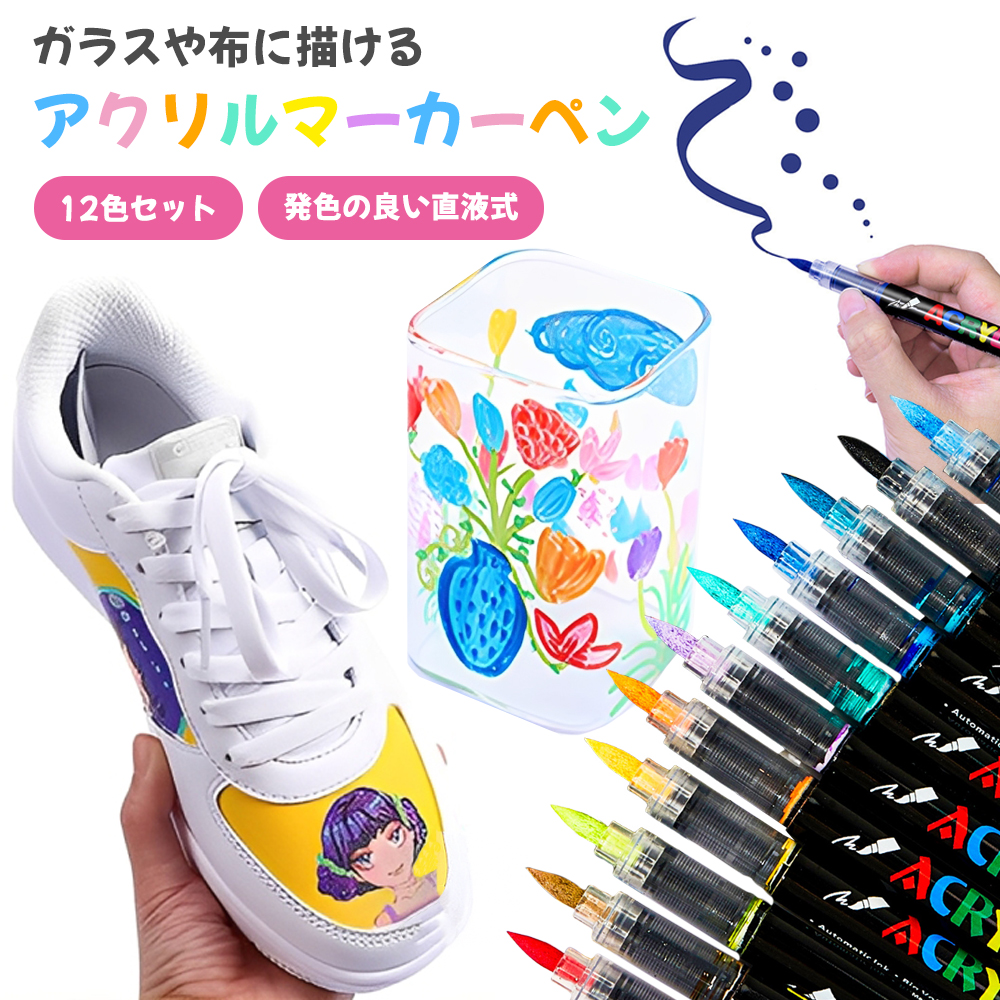 マーカーペン 12色セット アクリル水性インク 筆ペンタイプ 高発色 直液式 不透明 イラストマーカー 布 ガラス 陶器 アクリルアート 塗り絵 画材 プレゼント