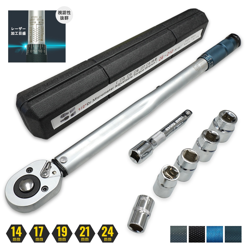 トルクレンチ 自動車 タイヤ交換 ソケットセット プレセット型 専用ハードケース付き ホイール交換28-210N・m 14/17/19/21/24 延長アダプタ ラチェット