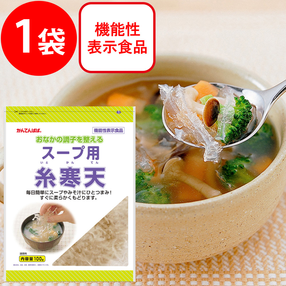 寒天の良質な食物繊維を手軽にお取り頂けます。スープ用糸寒天をスープや味噌汁の中へ直接入れ、よくまぜてお召あがりください。水に戻してサラダにも使えます。衛生的な自社工場で作られています。屋外で製造される天然の寒天と違い、ゴミがなく、安心して召しあがって頂けます。