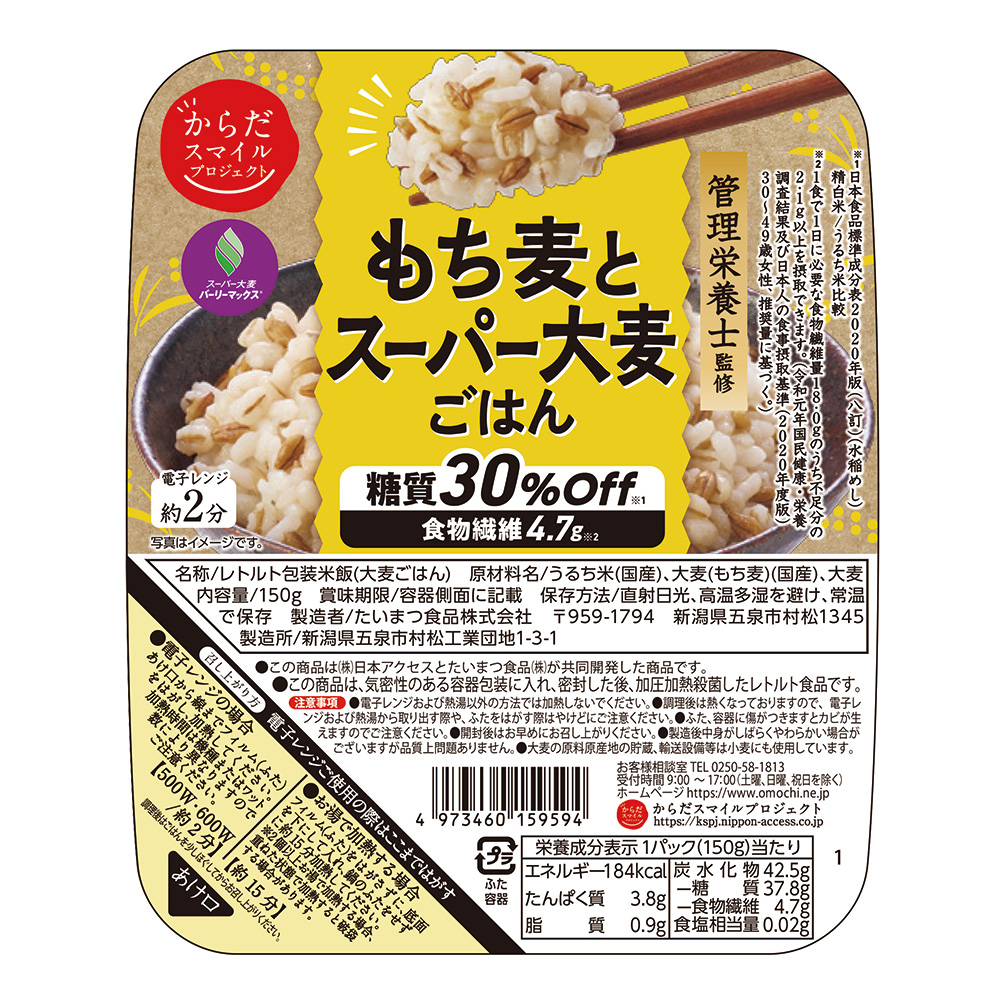 からだスマイルプロジェクト初の糖質オフ商品です。糖質30%offで1食で食物繊維を4.7g摂取出来ます。人気のもち麦とスーパー大麦を国産米(うるち米)に合わせて炊き上げました。家族の食卓にも、お一人での食事にも。一食分でも、一品だけでも。いつもの食事にささっと「からだスマイルプロジェクト」をプラスして、手軽に栄養バランスを整え、健康的で美味しい食生活を楽しめます。