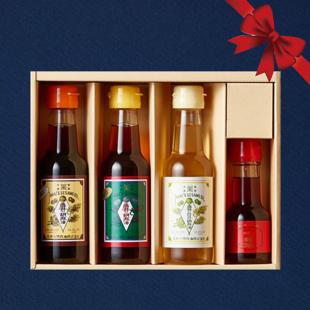 大切な人への贈り物【安政4年創業、昔ながらの圧搾製法】安政4年(1857年)創業。有機溶剤を使用しない昔ながらの圧搾製法で油を搾ります。道具が変わっても、豊かな風味・香味を守る搾油法そのものは、160年前と変わることがありません。【抜群の風味・香味を生み出す職人技】岩井の胡麻油の特徴である風味・香味を引き出すために、原料である胡麻を丁寧に加熱・焙煎します。熟練の職人が胡麻の状態と、その日の気温や湿度などを見極め、五感を駆使しておこないます。胡麻油の個性も、この焙煎によって生まれるため、伝統の技が光る工程です。【岩井の胡麻油を味わえるギフトセット】純正胡麻油3点、辣油1点の4種セットをボックスに入れてお届けします。中華・韓国料理に最適な濃口、看板商品の金口、サラダ油のように使える香りの少ない白口と岩井の人気商品をお試しいただけます。