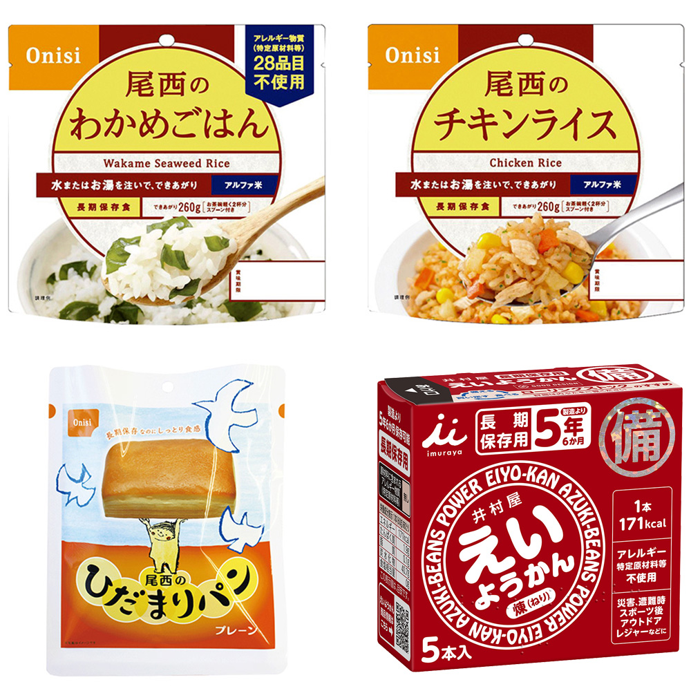 25年の歴史を持つ総合食品卸会社が運営し、家庭用から業務用まで幅広いニーズにお応えする、"Smile Spoon"が厳選した非常食アソートセットです!尾西のひだまりパン プレーン 70g/尾西食品 アルファ米 わかめごはん 1食分 非常食 100g/尾西食品 アルファ米 チキンライス 1食分 非常食100g/井村屋 えいようかん 300g(60g×5本)を各種1個ずつ詰め合わせております。