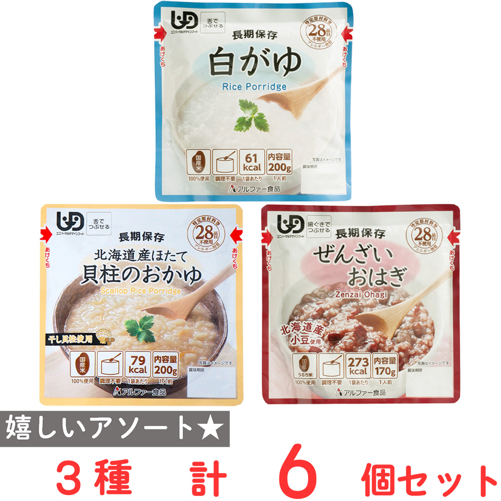 30年の歴史を持つ総合食品卸会社が運営し、家庭用から業務用まで幅広いニーズにお応えする、Smile Spoonが厳選したアソートセットです!異なる魅力的な商品をお楽しみいただけます。アルファ―食品 レトルトタイプ 白がゆRT 200g/アルファ―食品 レトルトタイプ 北海道産ほたて貝柱のおかゆRT 200g/アルファ―食品 レトルトタイプ ぜんざいおはぎRT 170g/各2個ずつ詰め合わせております。