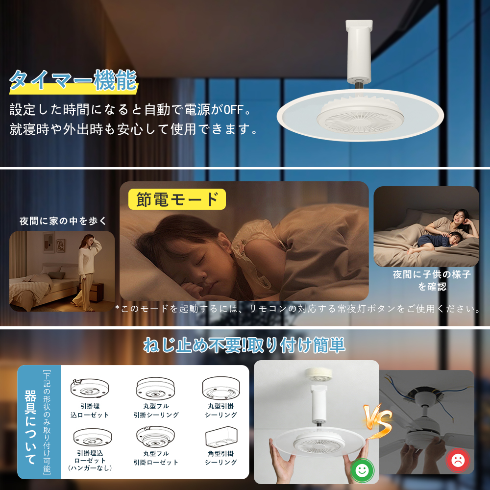 簡単取り付け、工事不要面倒な工事は一切不要。引掛けシーリング式で、天井の配線器具にカチッとはめるだけの簡単取り付け。工具不要で、初めての方でも安心して設置でき、賃貸住宅にもおすすめです。