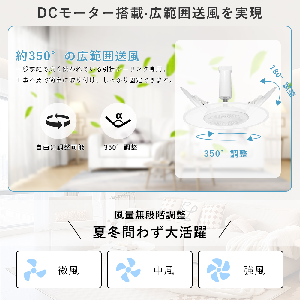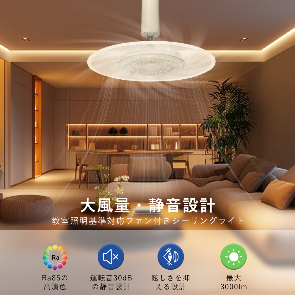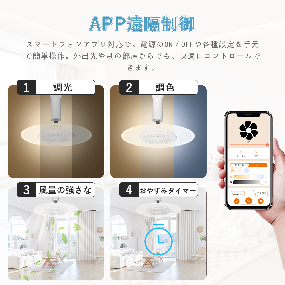 スマート操作対応専用アプリや音声アシスタント(Google、Alexa)を利用することで、手軽に風量、照明の明るさ、色温度を調整できます。音声コマンドでライトやファンの設定が可能で、家事や仕事をしながらも簡単に操作できます。
