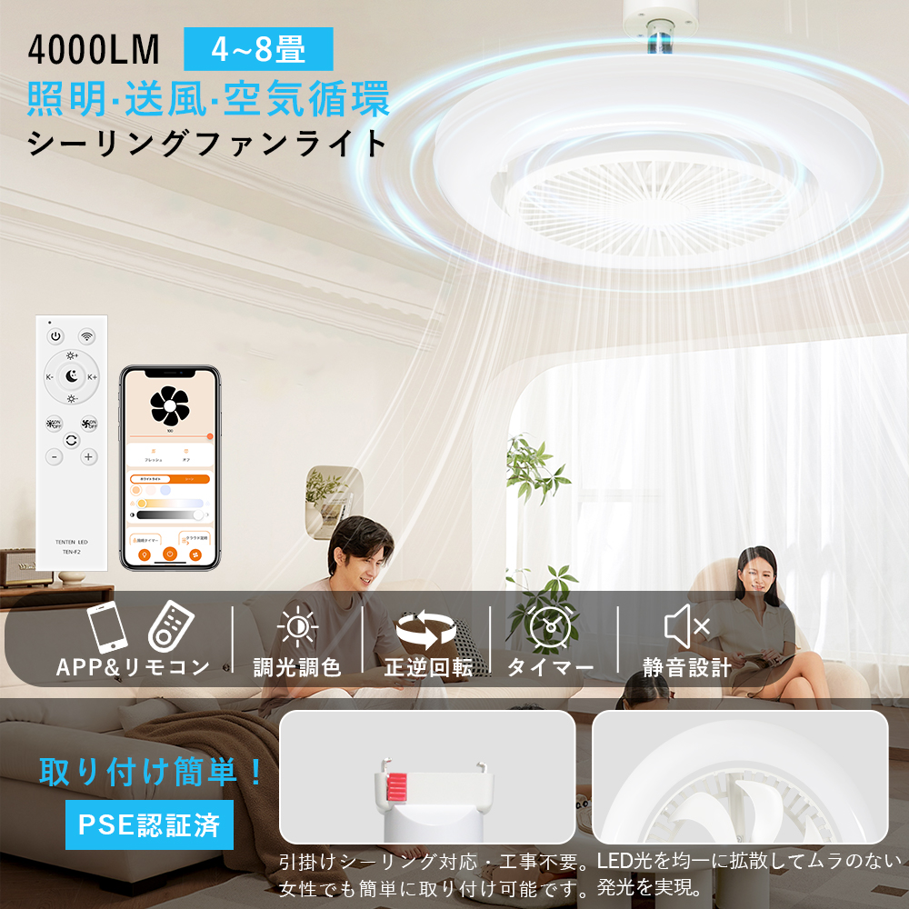 | スマート操作対応 | 専用アプリや音声アシスタント(Google、Alexa)を利用することで、手軽に風量、照明の明るさ、色温度を調整できます。音声コマンドでライトやファンの設定が可能で、家事や仕事をしながらも簡単に操作できます。 |