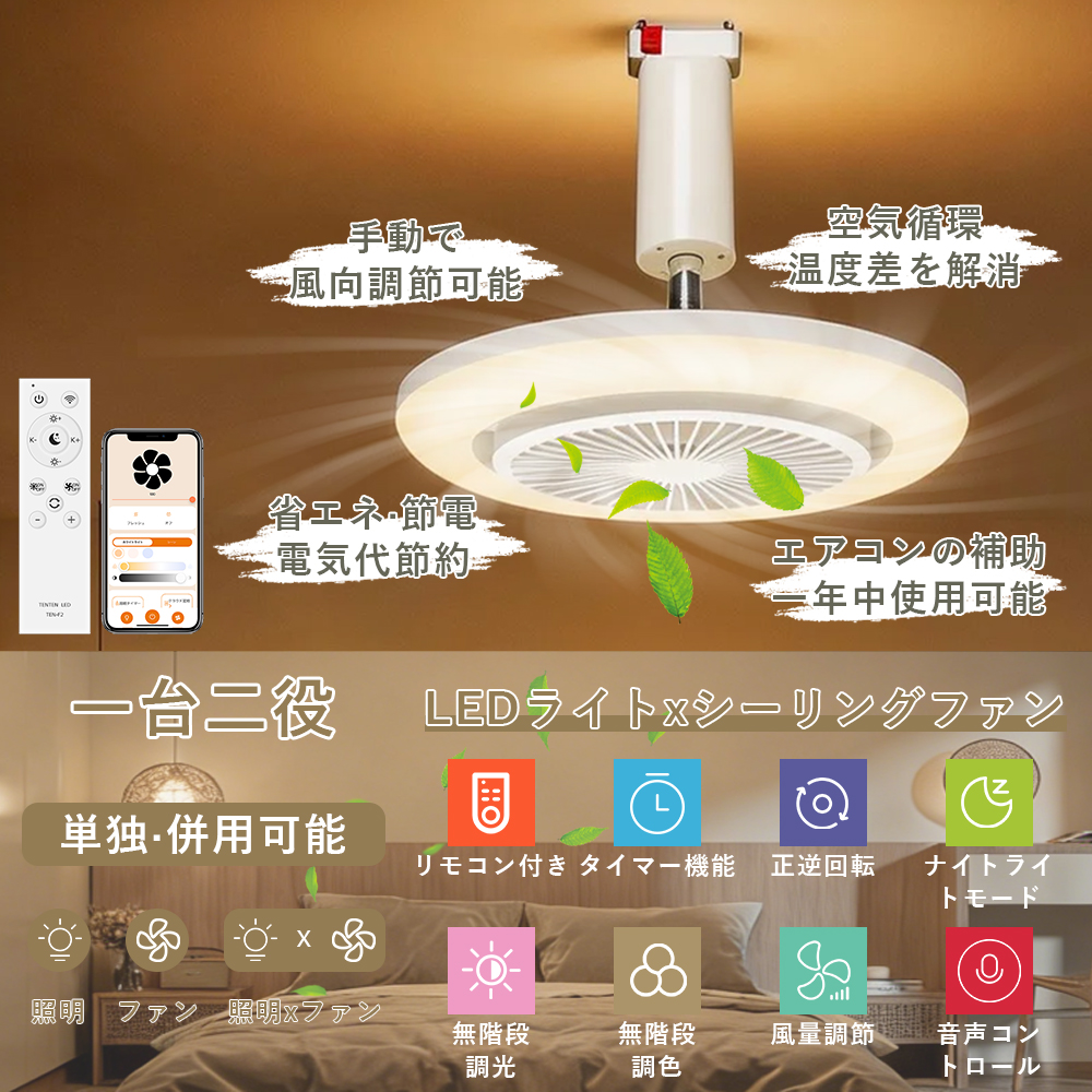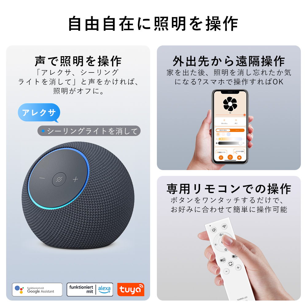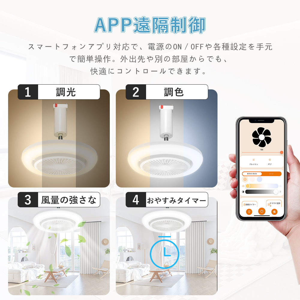 スマート操作対応専用アプリや音声アシスタント(Google、Alexa)を利用することで、手軽に風量、照明の明るさ、色温度を調整できます。音声コマンドでライトやファンの設定が可能で、家事や仕事をしながらも簡単に操作できます。