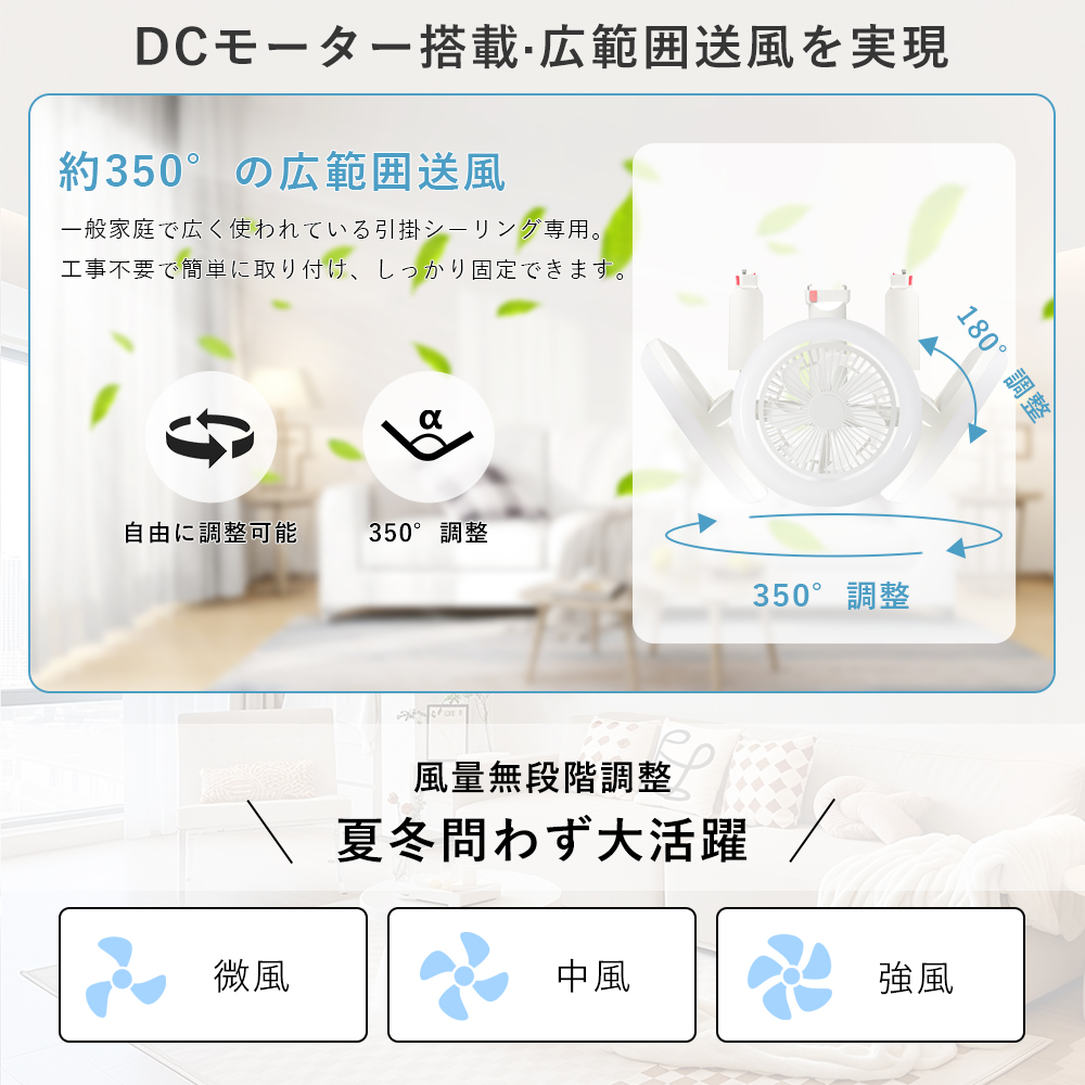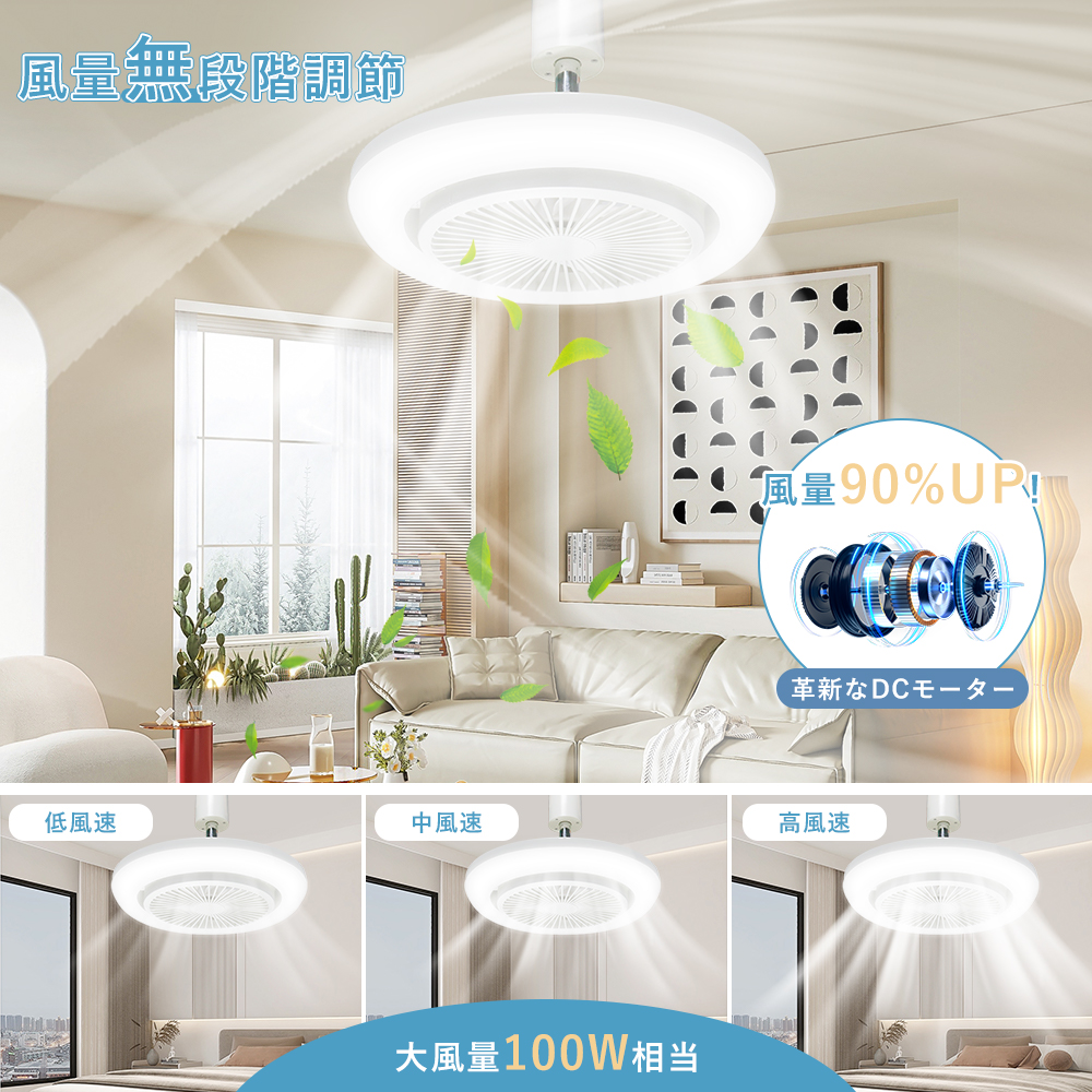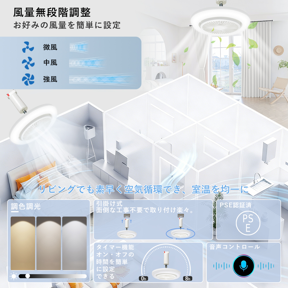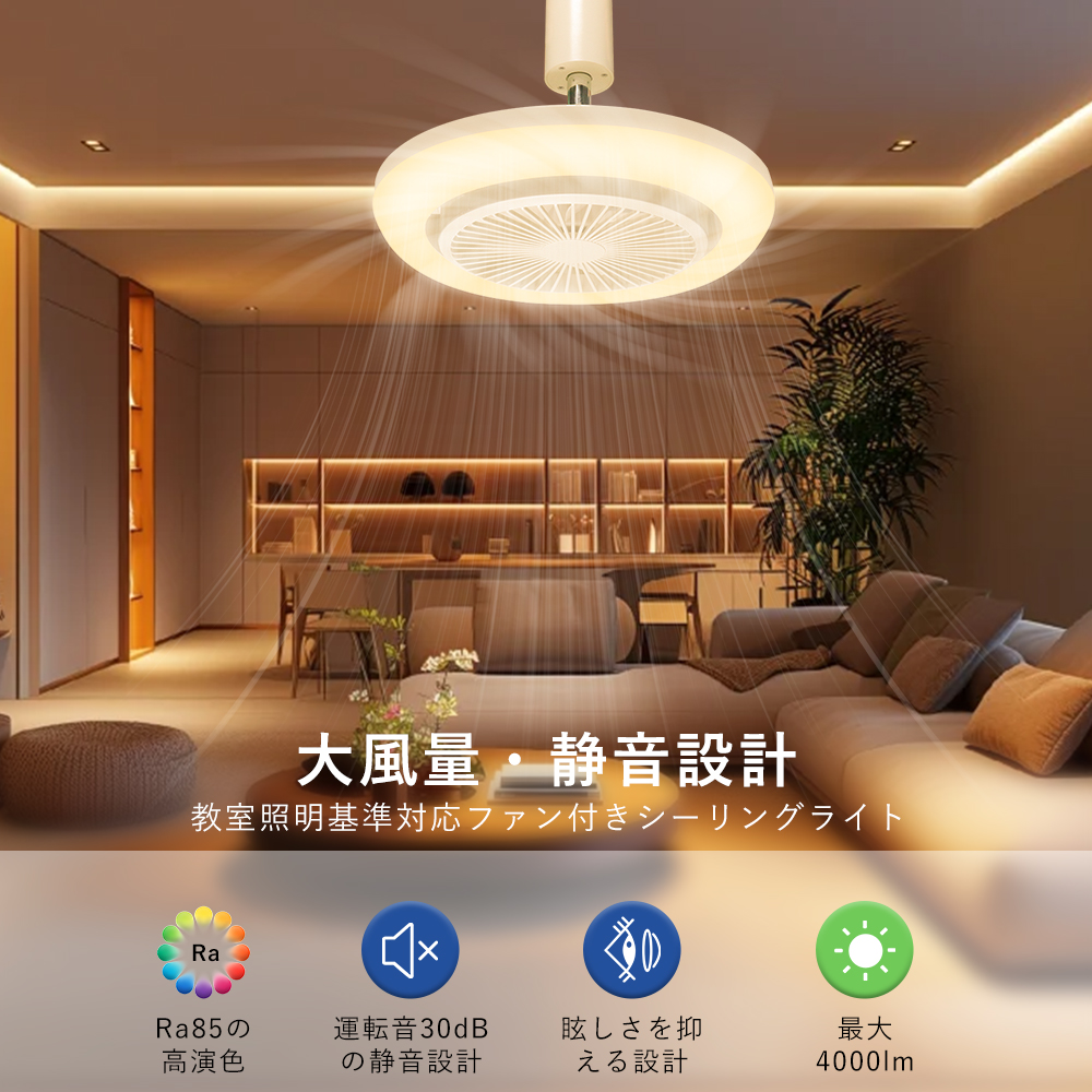 スマート操作対応専用アプリや音声アシスタント(Google、Alexa)を利用することで、手軽に風量、照明の明るさ、色温度を調整できます。音声コマンドでライトやファンの設定が可能で、家事や仕事をしながらも簡単に操作できます。
