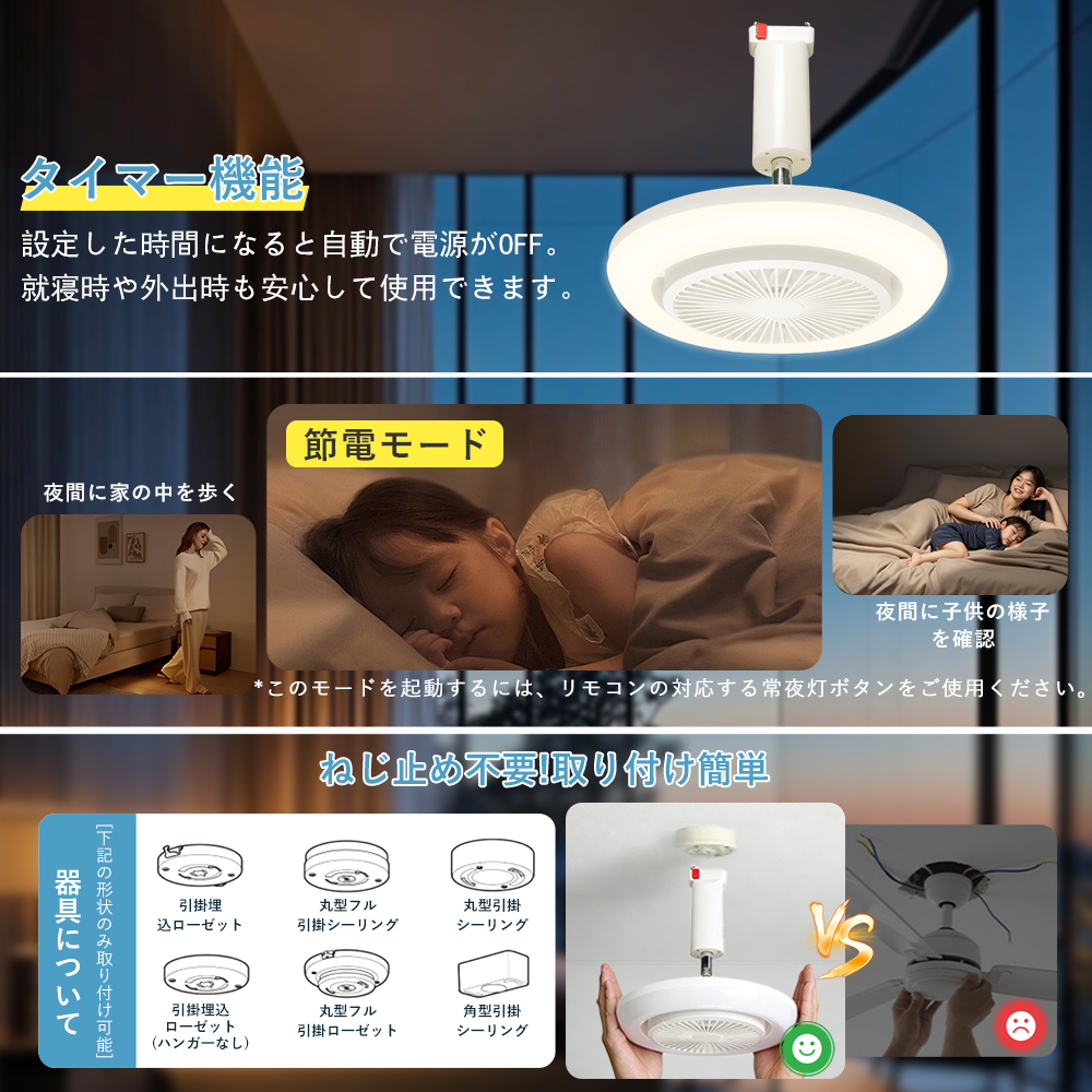 簡単取り付け、工事不要面倒な工事は一切不要。引掛けシーリング式で、天井の配線器具にカチッとはめるだけの簡単取り付け。工具不要で、初めての方でも安心して設置でき、賃貸住宅にもおすすめです。