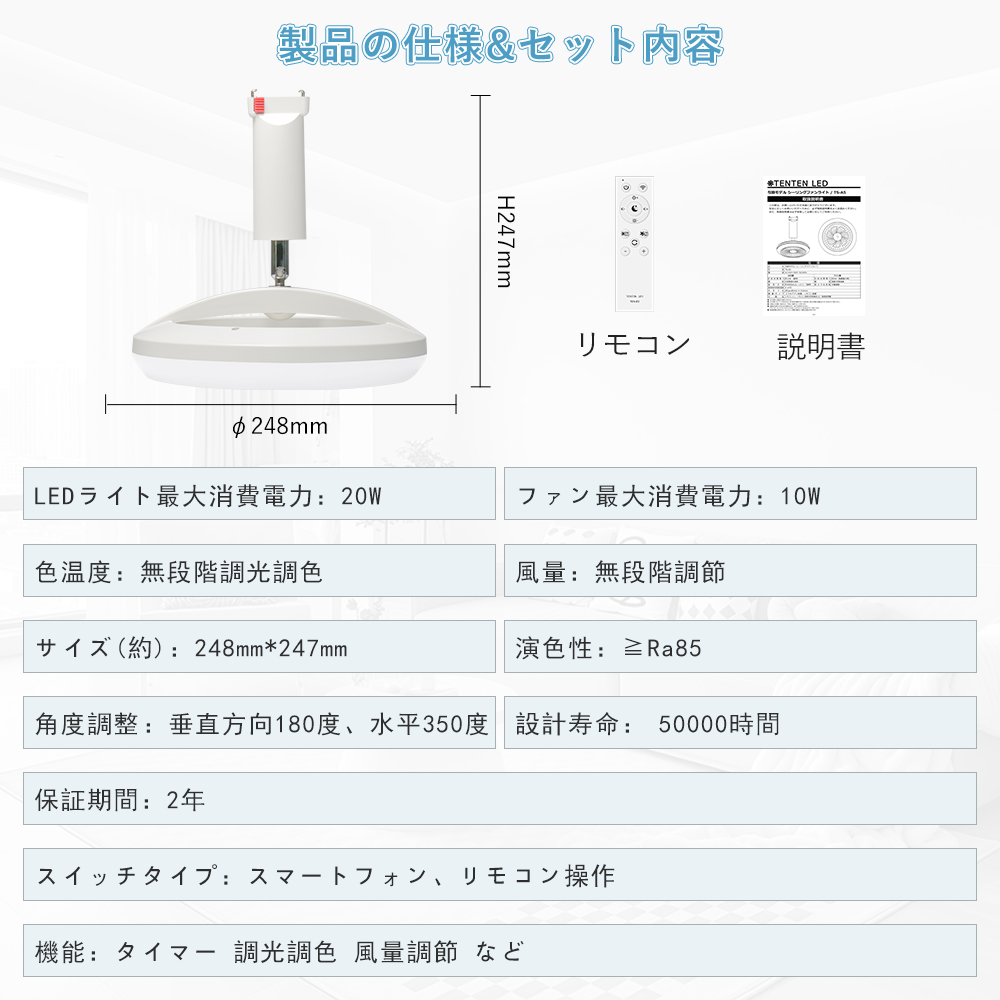 特徴 リモコン/スマート操作対応・無段階調光調色機能・タイマー機能・メモリー機能・常夜灯モード・均一でやさしい光を実現
