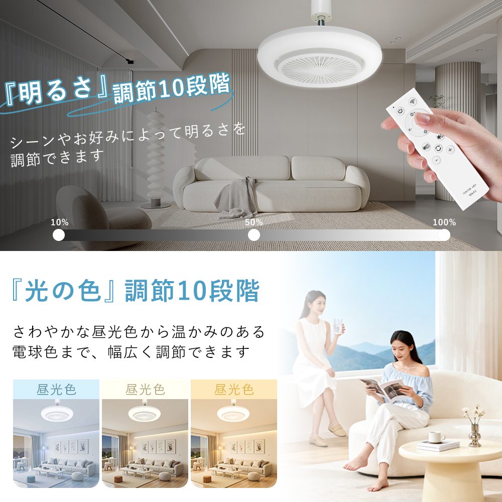 無段階調光調色と風量調節機能ユーザーはニーズに応じて光の明るさと色温度を自由に調整し、理想的な雰囲気を作り出すことができます。温かみのある黄光から明るい白光まで、自由に切り替えることができ、さまざまなシーンに対応します。同時に、風量調節機能も多様な風速オプションを提供しており、柔らかな微風から強力な風力まで、ユーザーの快適さに応じて精密に調整できるため、居住空間をより快適に保つことができます。
