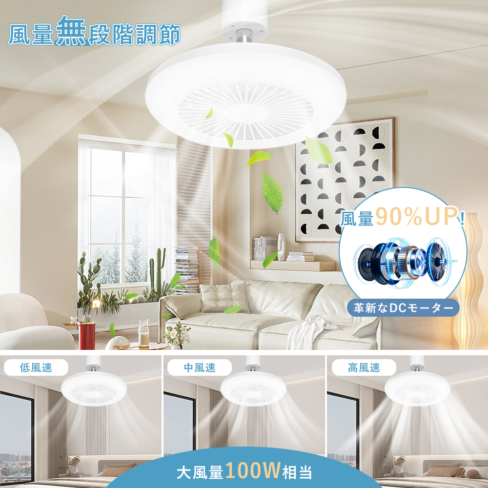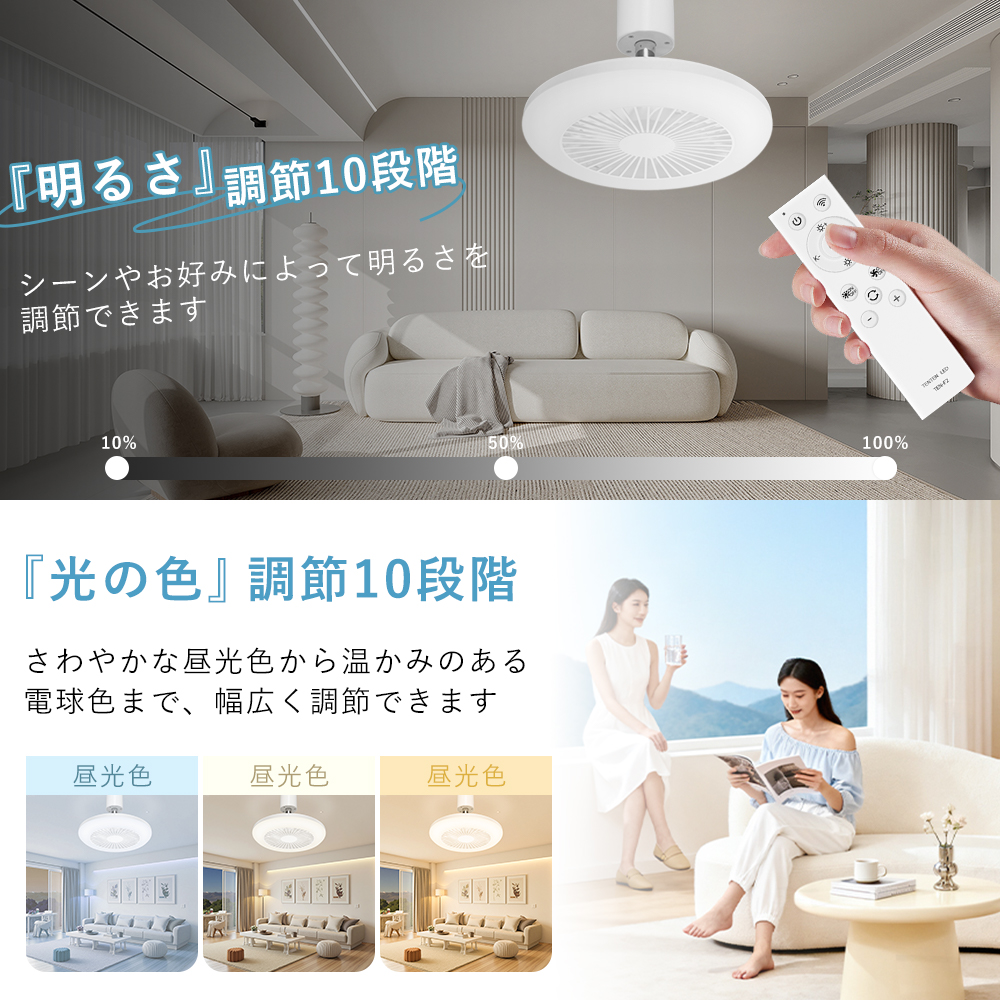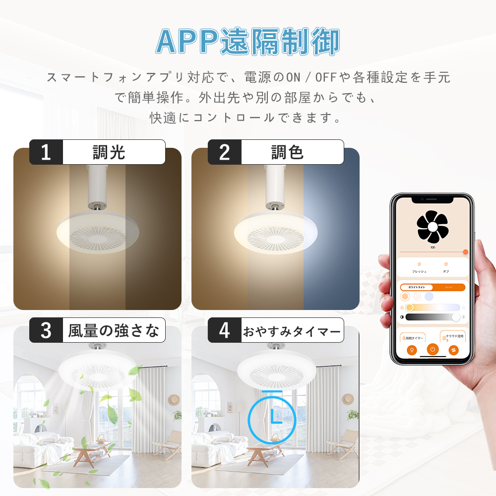 スマート操作対応専用アプリや音声アシスタント(Google、Alexa)を利用することで、手軽に風量、照明の明るさ、色温度を調整できます。音声コマンドでライトやファンの設定が可能で、家事や仕事をしながらも簡単に操作できます。