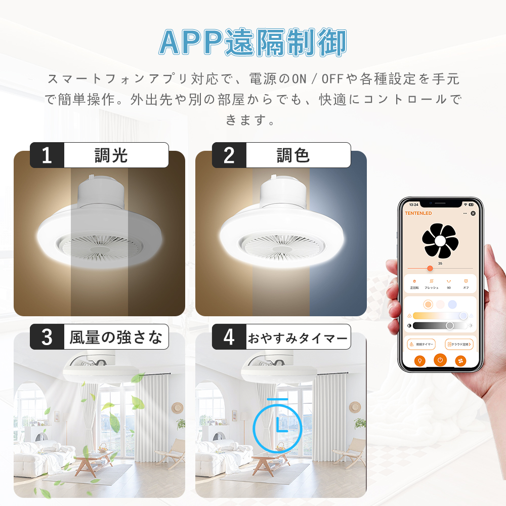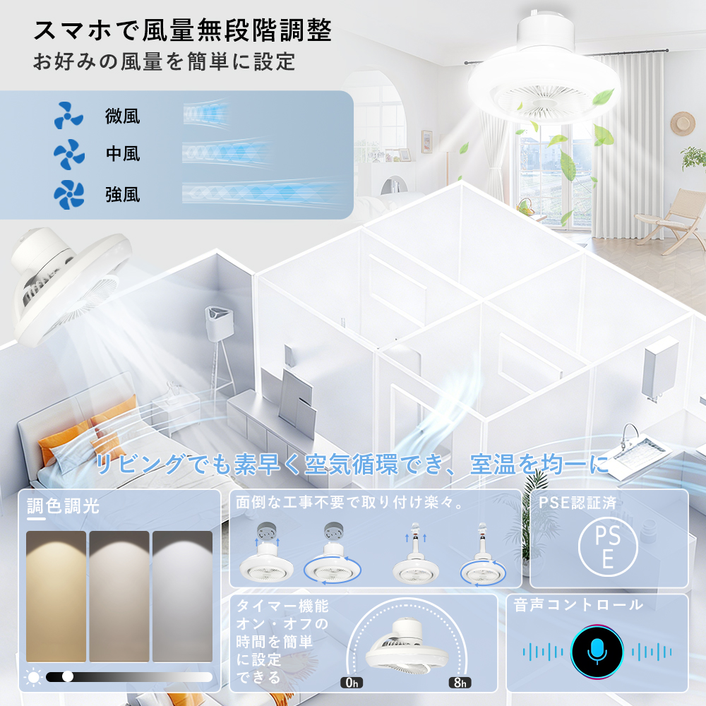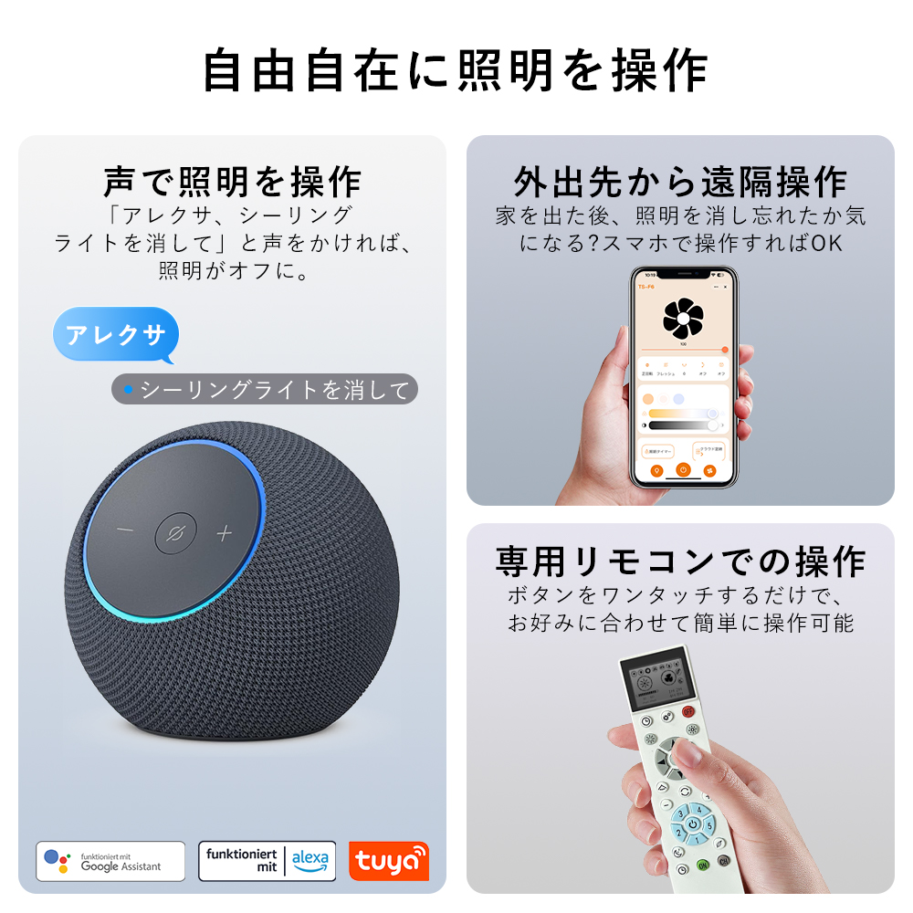 | 【スマート操作対応】 | 専用アプリや音声アシスタント(Google Home、Alexa)を利用することで、手軽に風量、照明の明るさ、色温度を調整できます。音声コマンドでライトやファンの設定が可能で、家事や仕事をしながらも簡単に操作できます。 |