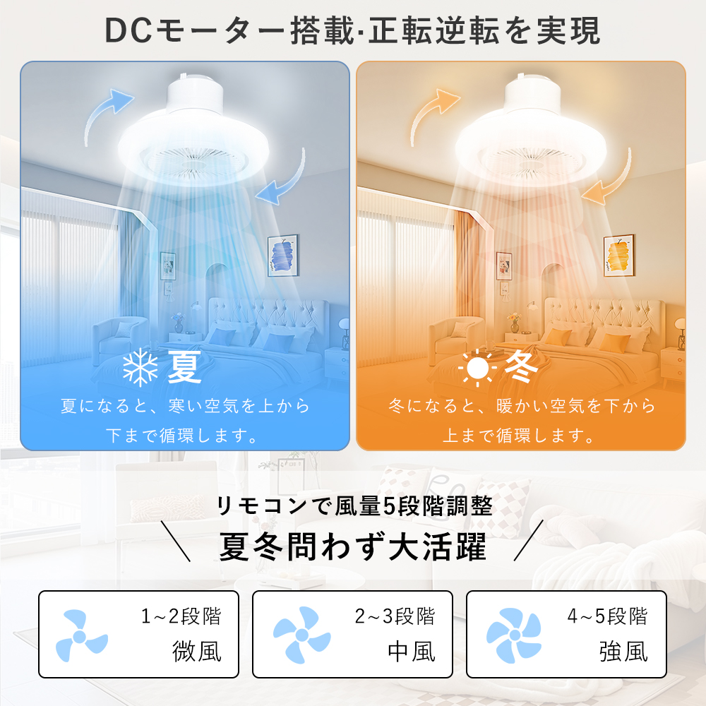 | 【夏季と冬季の両方で使用可能】 | 正回転機能は通常、夏季に涼しい効果を生み出し、空気を上から下へと押し下げ、心地よい涼風を提供し、室内温度を迅速に下げるのに役立ちます。一方、逆回転機能は冬季に適しており、暖かい空気を天井から下に送り、全体の暖房効果を高め、居住空間をより温かく快適にします。 |