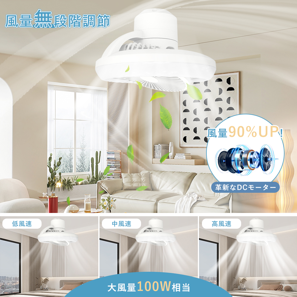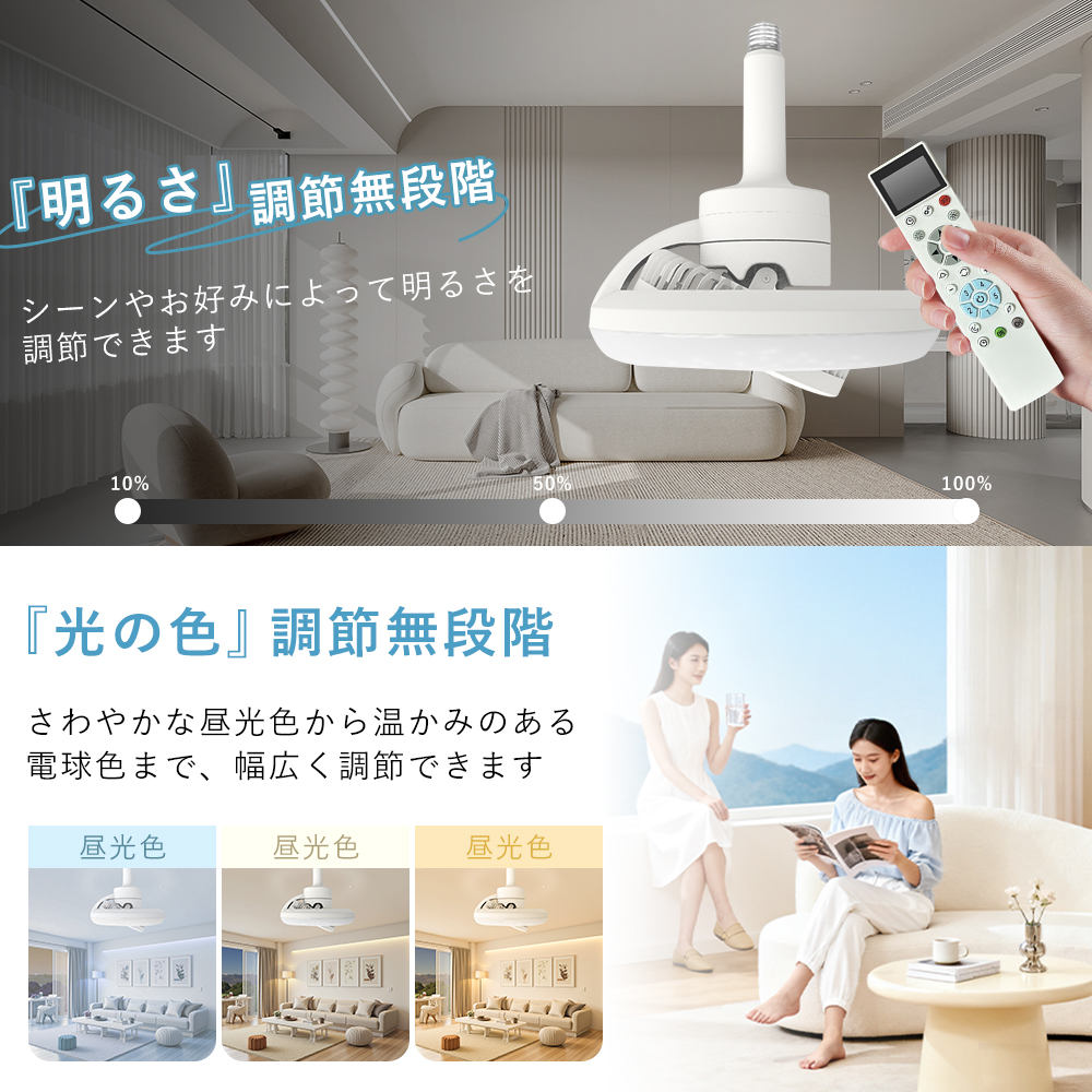 | 【無段階調光調色と風量調節機能】 | ユーザーはニーズに応じて光の明るさと色温度を自由に調整し、理想的な雰囲気を作り出すことができます。温かみのある黄光から明るい白光まで、自由に切り替えることができ、さまざまなシーンに対応します。同時に、風量調節機能も多様な風速オプションを提供しており、柔らかな微風から強力な風力まで、ユーザーの快適さに応じて精密に調整できるため、居住空間をより快適に保つことができます。 |