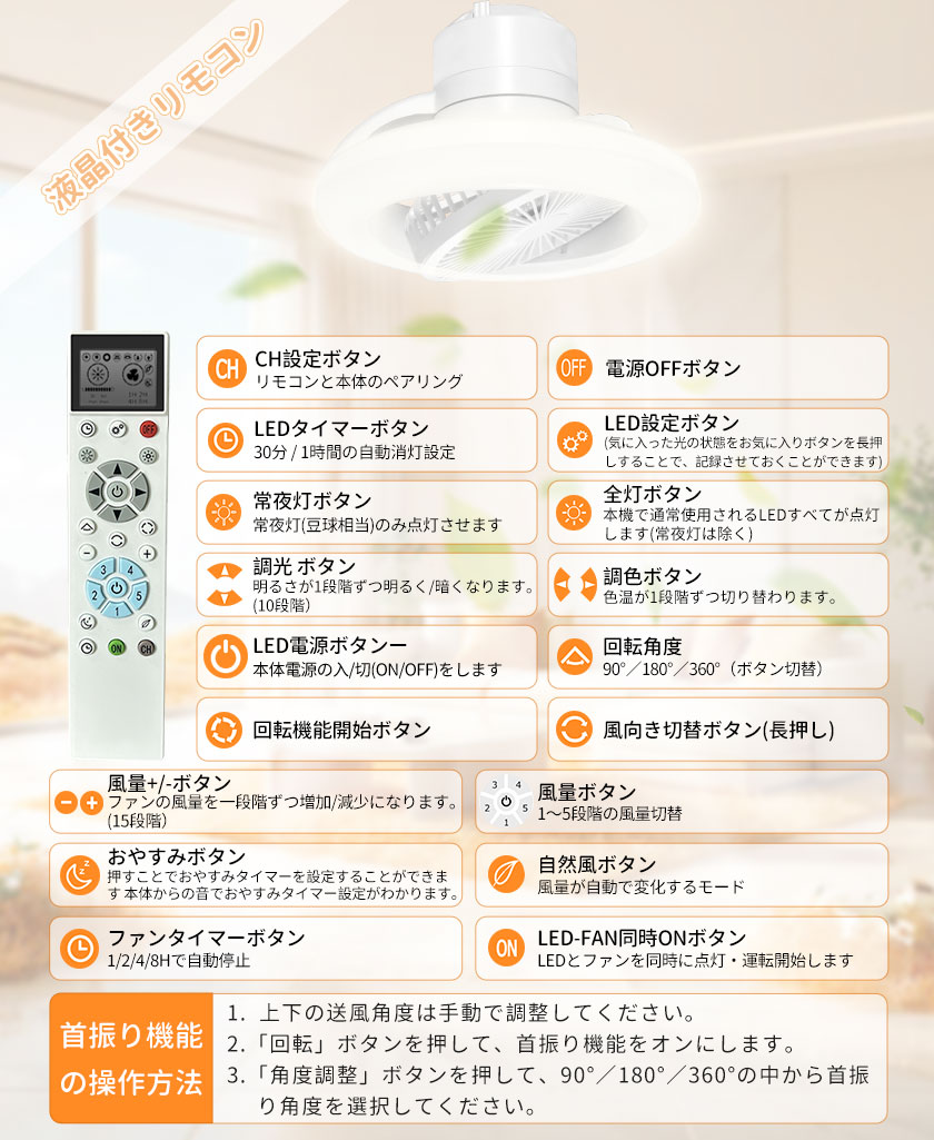 ●梱包内容:シーリングファンライト本体、リモコン、リモコンホルダー、ネジ止め用、3M両面テープ、乾電池(単4形)、日本語取扱説明書