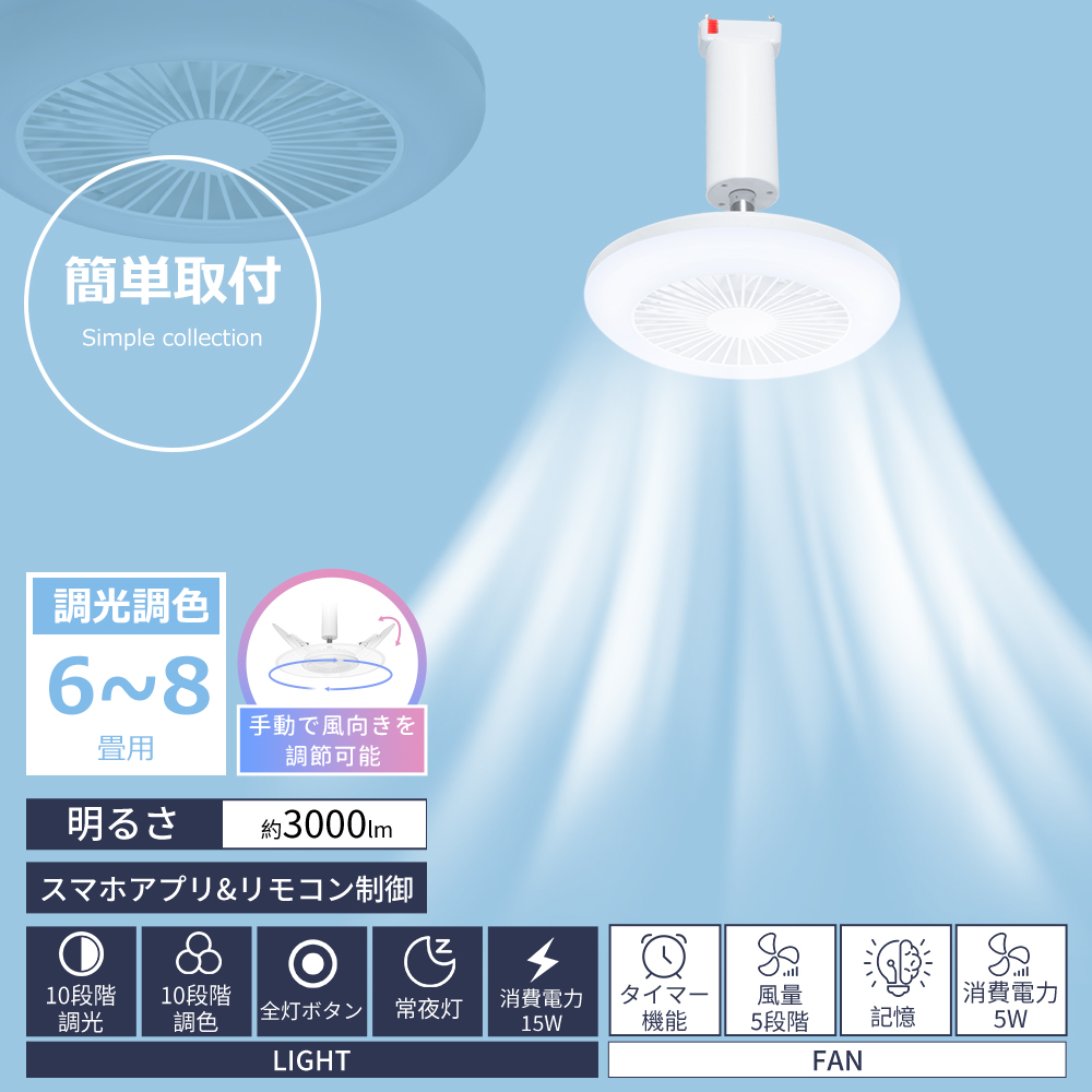 | 専用アプリでスマホから簡単操作 | Wi-Fi接続により、スマートフォン専用アプリから明るさ・風量・色温度などをいつでも簡単に調整可能。外出先からでも状態確認や操作ができ、家にいれば音声操作にも対応。ソファでくつろぎながら、ベッドに入ったままでも快適にコントロールでき、毎日の暮らしをよりスマートにします。 |