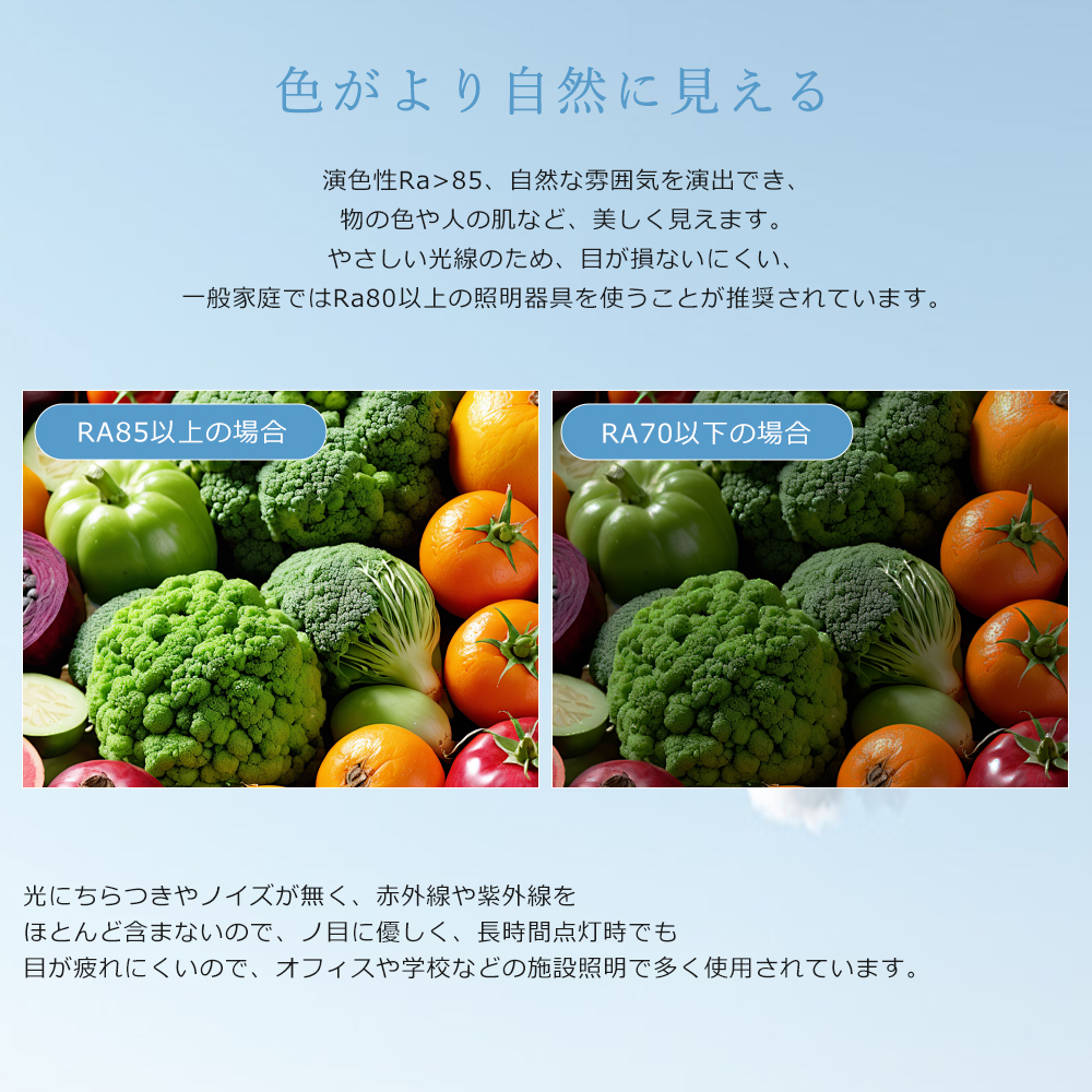 | 【発熱量が少ない】 | LEDは発熱量が少ないため、通常の蛍光灯と比較して光の下でも暑くありません。赤外線や紫外線をほとんど含まないため、色あせなども抑えられます。 |