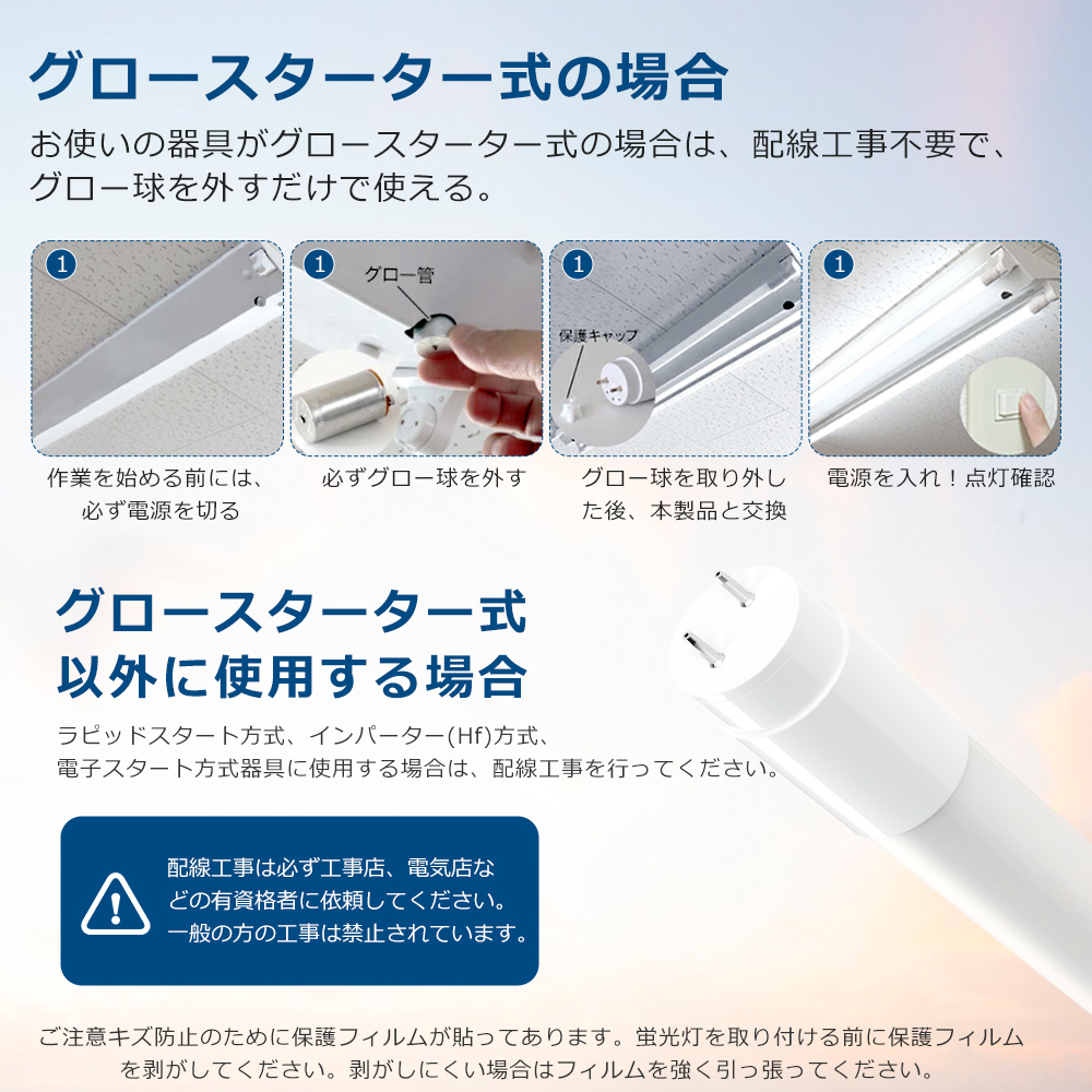| 【グロー式工事不要】 | ※両側給電対応 グロー式工事不要! グロースターター方式の器具は、グロー点灯管を取り外すだけで、そのままご使用できます。※ ラピッドスタート式&インバータ式の場合、工事は必要です。 *電気資格者による配線工事を行うようお願い致します。 |