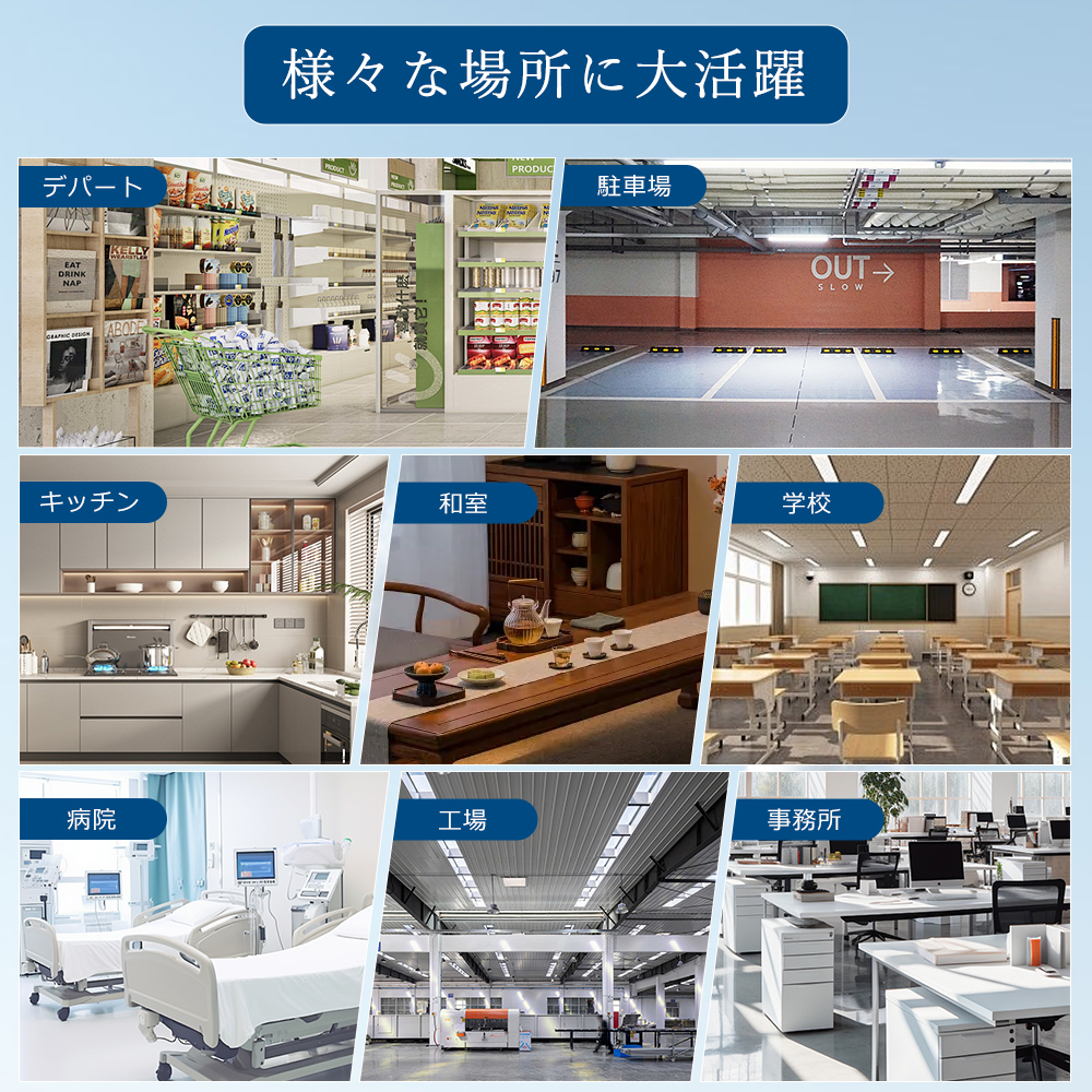 | 【いろいろ場所で活躍している】 | 家庭と商業両方とも利用できます。家、会社、駐車場、学校、病院、図書館、工場、レストラン、営業ホール、スーパーマーケットなど様々なところに適しています。 |