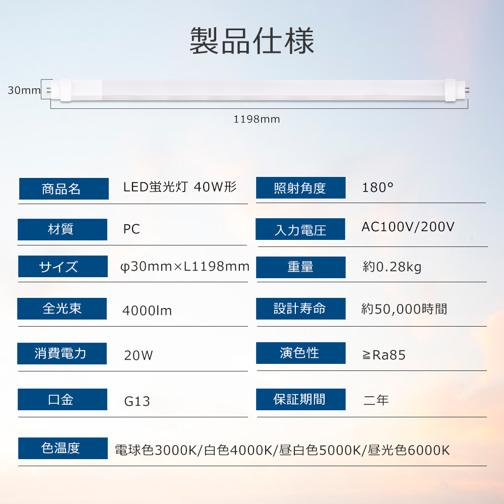 | 色温度 | 電球色3000K/白色4000K/昼白色5000K/昼光色6000K |