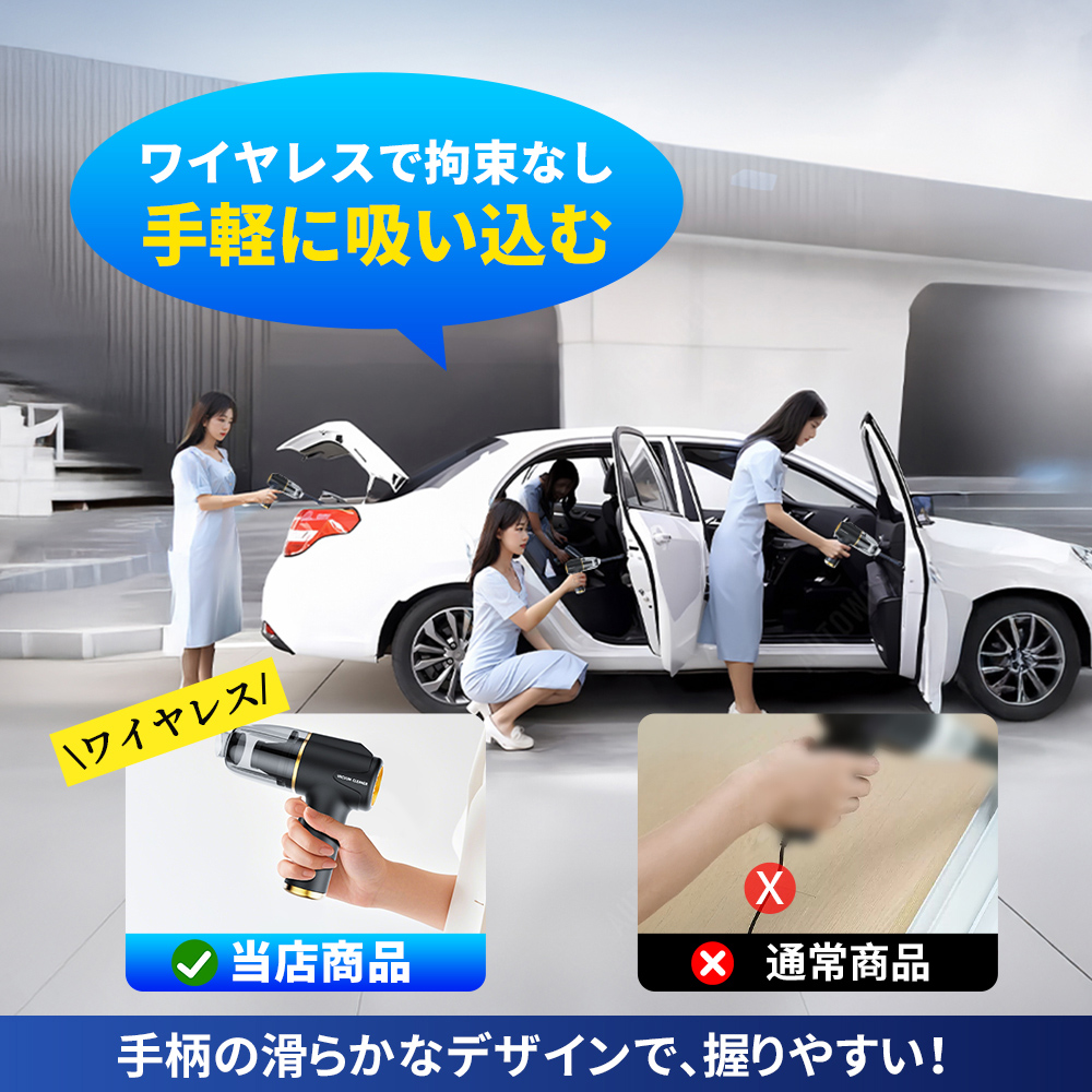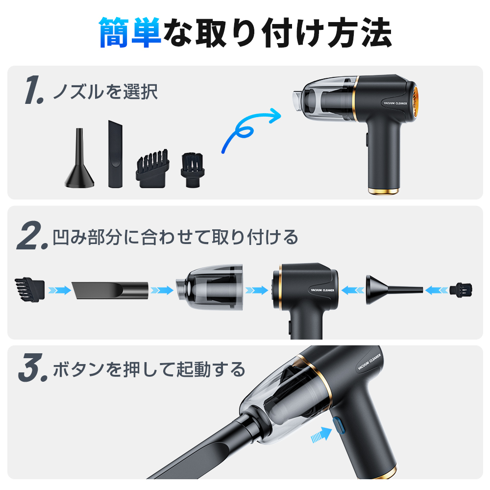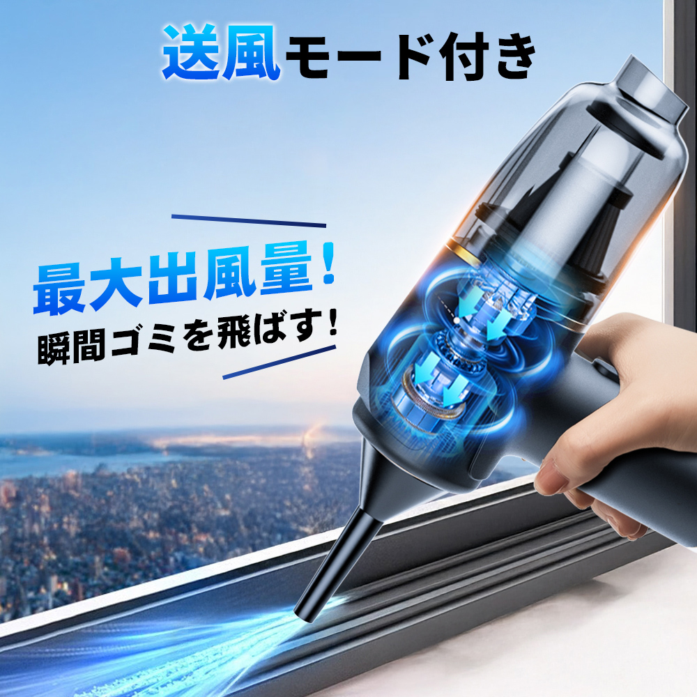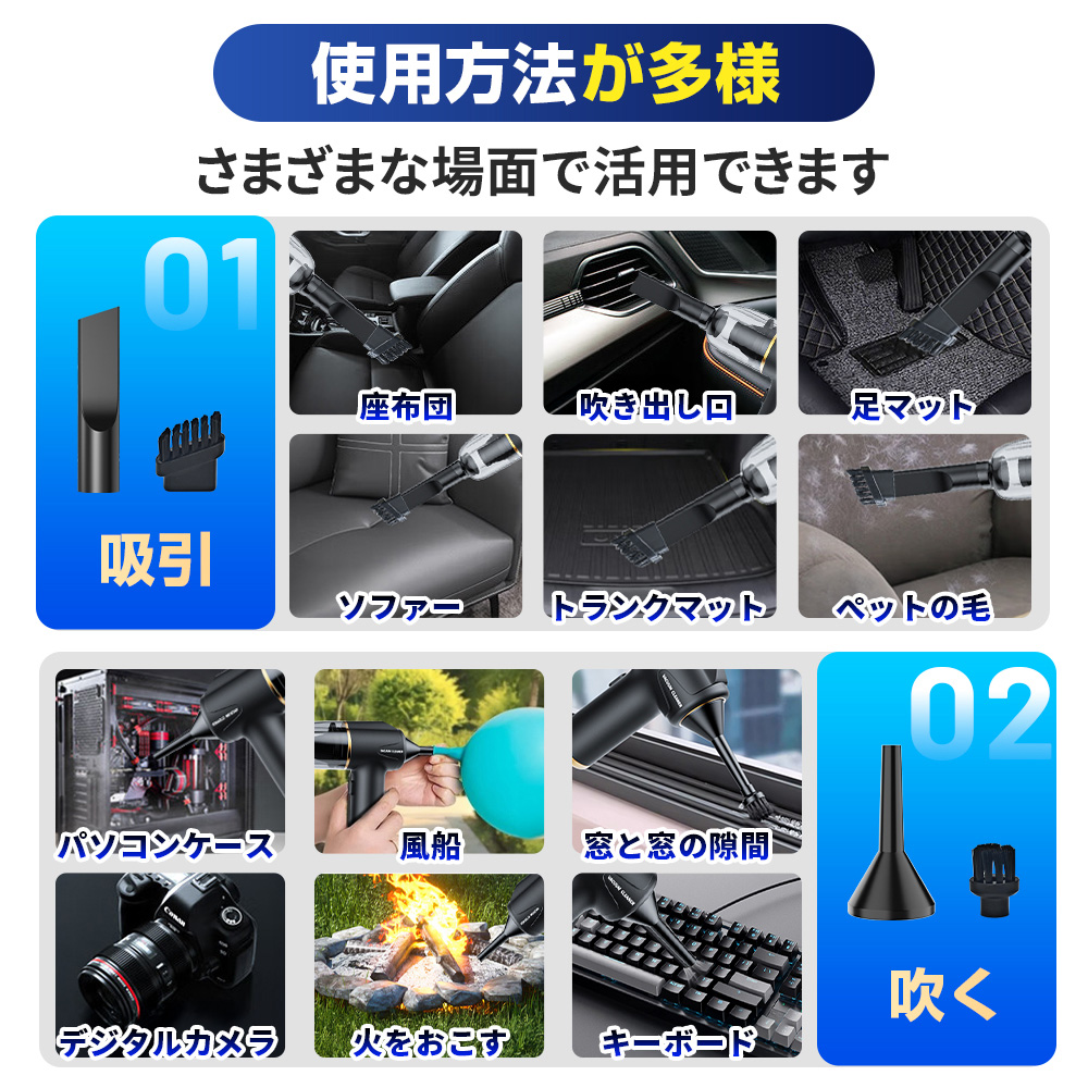 吸引と吹き出しの両方の機能を備えた車用掃除機、ゴミやほこりの吸引だけでなく、エアコンや細かい箇所の吹き出しにも効果的に対応します。