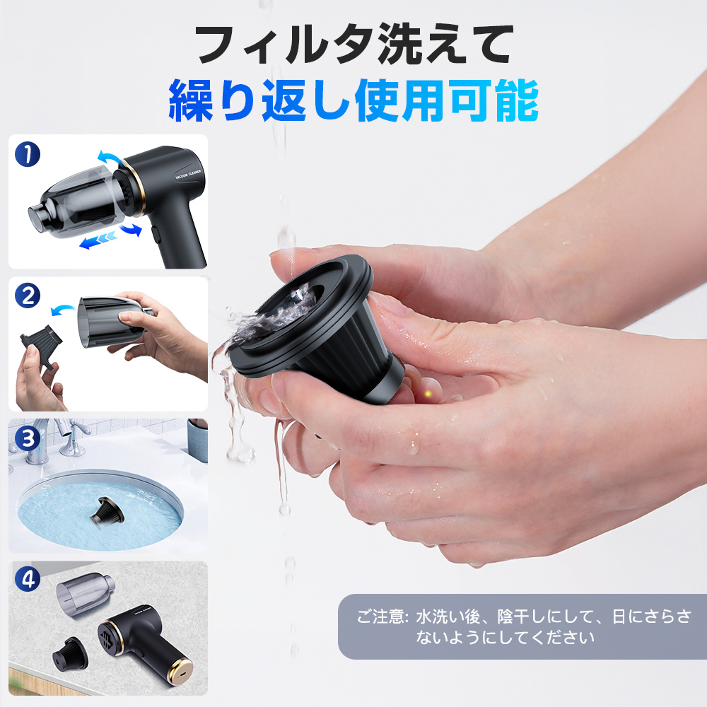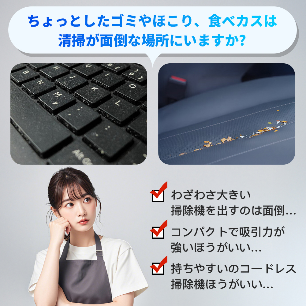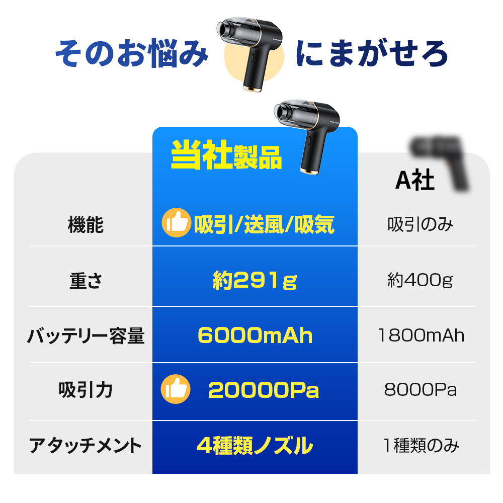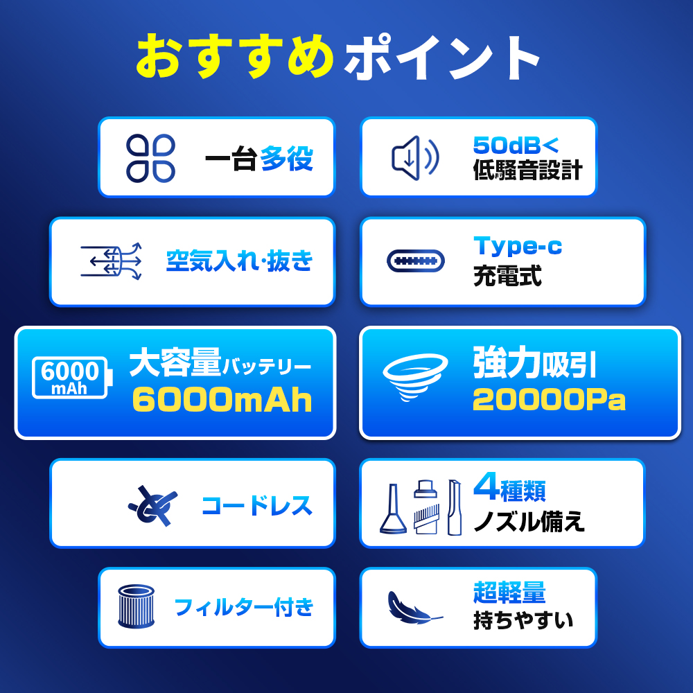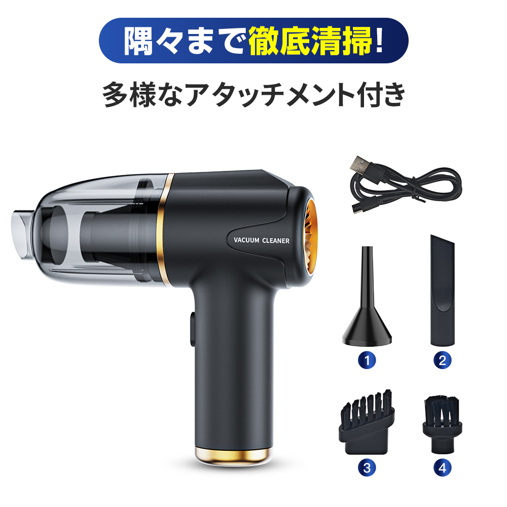 吸引と吹き出しの両方の機能を備えた車用掃除機、ゴミやほこりの吸引だけでなく、エアコンや細かい箇所の吹き出しにも効果的に対応します。