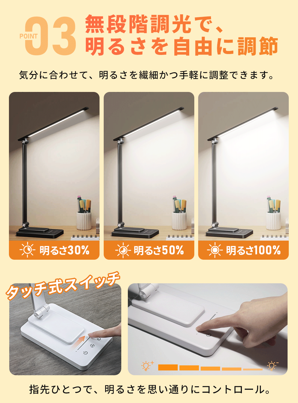 タッチ式で操作簡単に光量を調節できます。使用シーンに応じて最適な光を選べます。