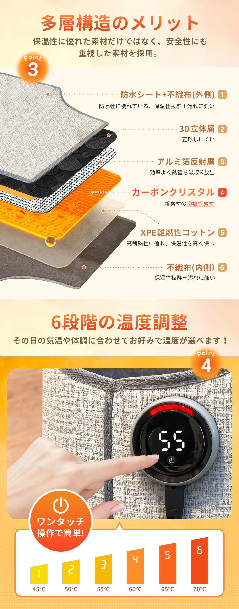 使用環境やお好みに合わせて、6段階で細かく温度調整が可能。快適な暖かさを自由に選べます。