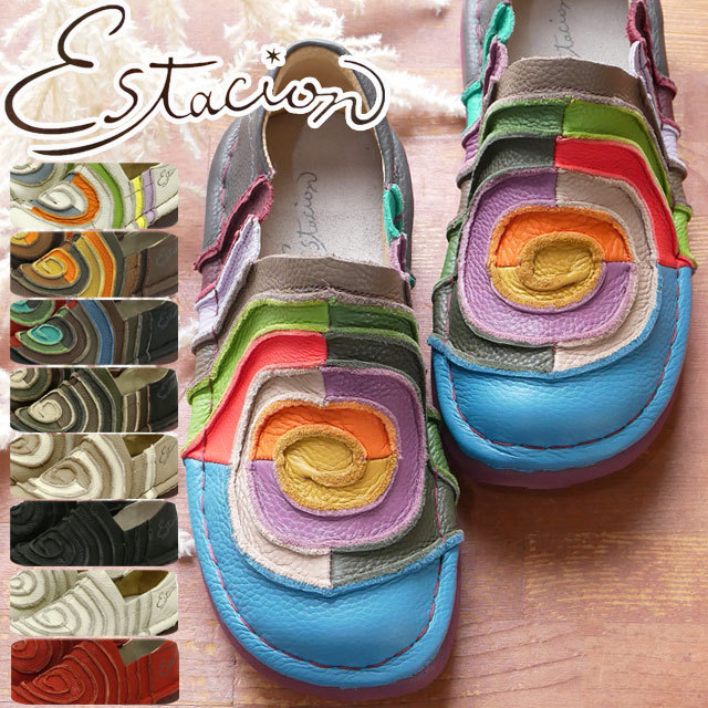 エスタシオン 靴 レディース スリッポン ローカット カラフル オブリークトゥ コンフォートシューズ TG043 本革 ぐるぐる 渦巻き 痛くない 履きやすい 疲れない