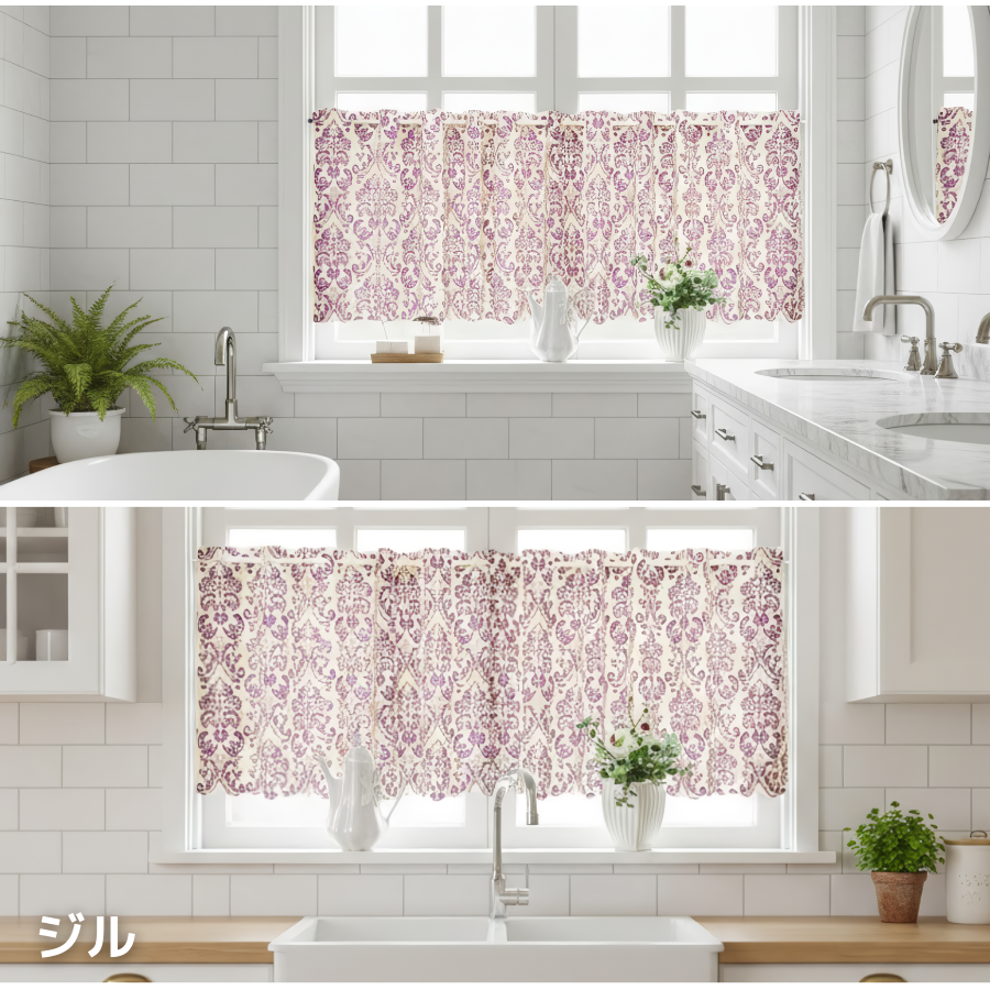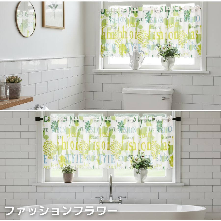 特徴: 水を弾くカフェカーテン。透けにくいので目隠しとして、お風呂やキッチンなど水回りに。