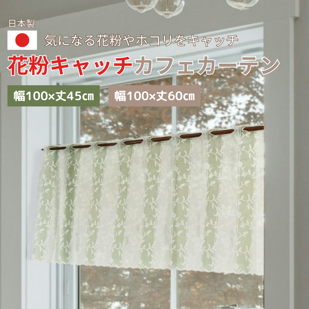 カフェカーテン ホコリキャッチ 花粉 小窓 日本製 おしゃれ レース 北欧 リーフ柄 キッチン 100幅 45丈 60丈 100×45 100×60