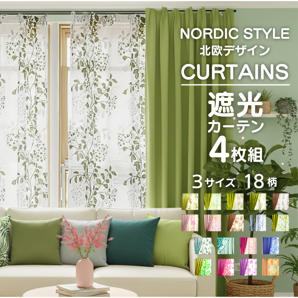 カーテン 4枚セット 遮光 柄 北欧 おしゃれ 安い おすすめ 洗える 無地 かわいい 花柄 リーフドレープ レースカーテン 北欧柄Bタイプ
