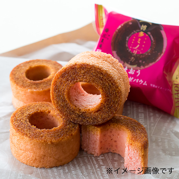 あまおう苺を生地に練りこみ、一層一層丁寧に焼き上げた苺の味わい広がる、しっとりなめらかなキャラメリゼのバウムクーヘン。
