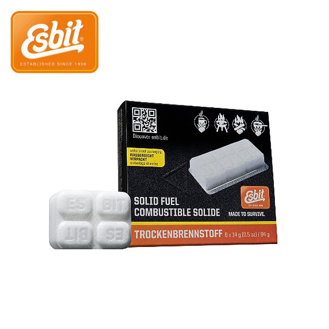詳細:固形燃料ミリタリー実験によるとタブレットの理想的な重量は燃焼効率を考慮すると14gである事がわかりました。軍隊での過酷な使用環境が考慮されミリタリーの固形燃料は完全防湿ブリスターパックとなっています。14gのタブレットが3タブレットづつブリスターパックされ6タブレット入りです。1タブレットで約12分燃焼します。500mlのお湯を沸かす場合などは14g1つで約7分30秒で沸かすことができ効率的です。お茶を1杯飲む場合などは、タブレットの半分又は1/4で十分です。その為、タブレットには凹みがつけてあり、容易に分割できるようになっています。燃焼中の固形燃料に分割したタブレットを追加投入することも簡単にでき燃焼時間を調節できます。火力は1タブレットあたり98kcal。エスビット固形燃料エスビットの固形燃料は高山や氷点下でも安定した炎で燃え、熱効率7,000kcal/kgとよく熱を発生し、煙をたてず、燃えかすを殆ど残さずに燃焼します。キャンプファイアやバーベキューの炭の火起し、ストーブのプレヒート、調理、湯沸かしなどアウトドアのアクティビティで役立ちます。引火点は約400℃で自然発火や爆発もしない為、安全に保管ができます。天災や大規模災害のようなときにも大いに役立ちます。(引火性が高い液体やガスの燃料は携行や安全の点に問題があります。又、燃えると液化するアルコール性固形燃料も同様に危険です。)エスビットはドイツやスイスなどのヨーロッパ他海外諸国の軍隊でも使用されていてます。食物の調理の他にも、飲用に適さない水を沸かしたり、冷凍食品を解凍したり、医療器具の消毒などにも使用されています。エスビットは軍隊用品として、また遠征隊などでも使用され、安全でしかも信頼できる燃料であることが実証されています。エスビット固形燃料の特徴・爆発性無し・燃料時液体化無し・スパーク無し・高カロリー7,000Kcal/kgs・燃え残り灰殆ど無し・目に見える煙無し・1箱(14g×6タブレット入り)・燃焼時間:1タブレット約12分・ドイツ製