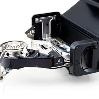 収納時はカセットこんろと分からないデザインですが、誰でも簡単に組立てられるように設計。 美しき輝くステンレス製のヒートシールドは輻射熱によるテーブルへのダメージを抑えます。 ハンドル付で持ち運びも簡単です。