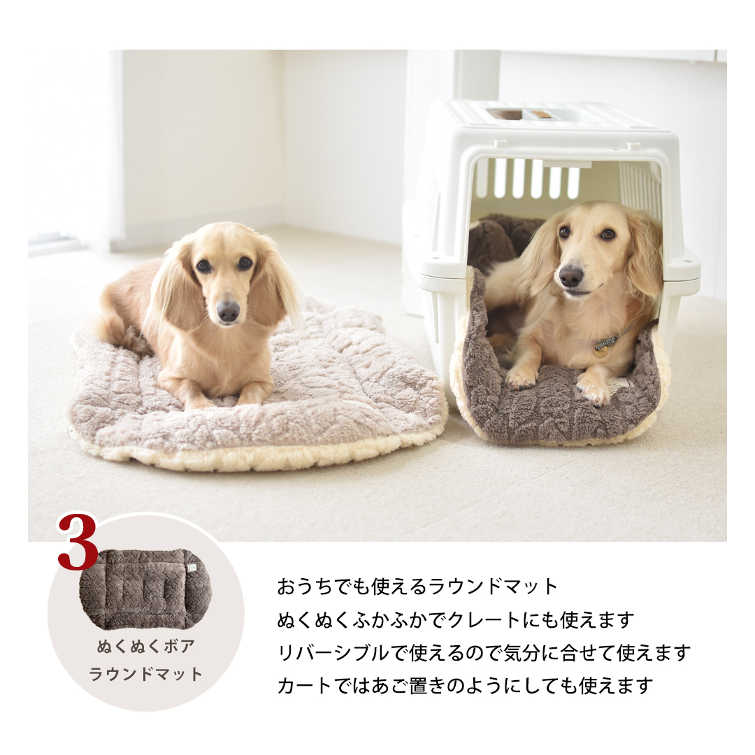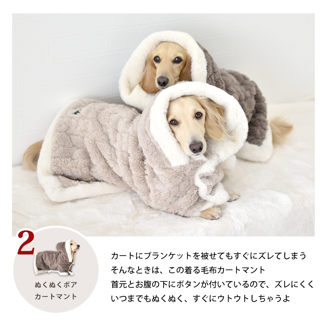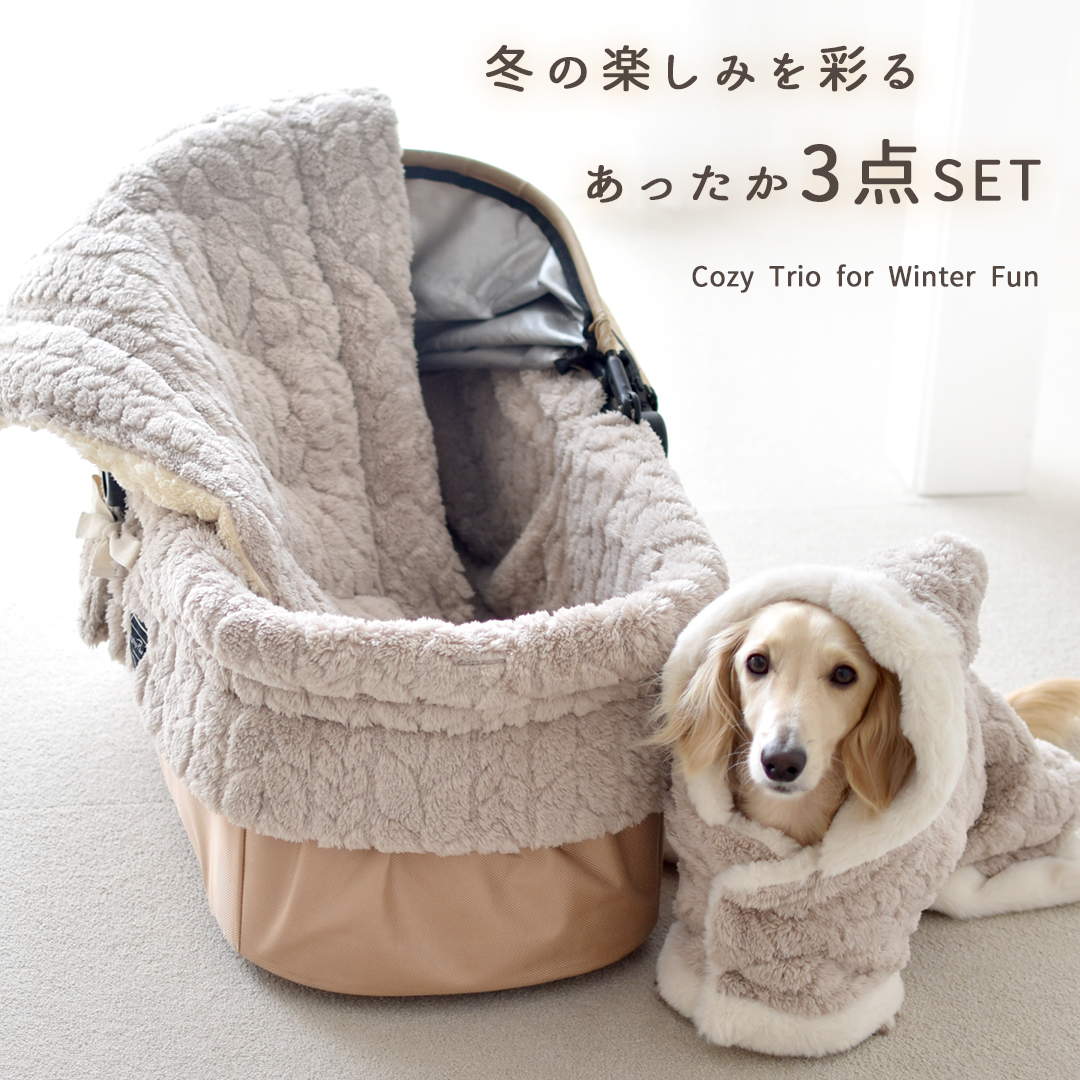 | 商品詳細 | これさえあれば安心冬のお出かけ暖か3点セット選べる2サイズ 別々で買うと¥12320(税込み)〜¥13420(税込み) セットでとってもお得// (1)選べる2サイズモコモコぬくぬくカートカバー (通常¥4620〜5720) マルチに使える大きなペットポーチ カートだけではなく、おうちのベットやドライビングベットにかぶせるだけで ふわふわモコモコの冬仕様に◎ ※フロントに名入れ刺繍もできます★ (2)リバーシブルで使える着る毛布もこもこぬくぬくガウン (通常¥3850) 両面とも保温性に優れた暖かな素材で、リバーシブルで使える暖かカート用マント。