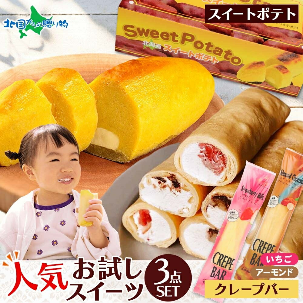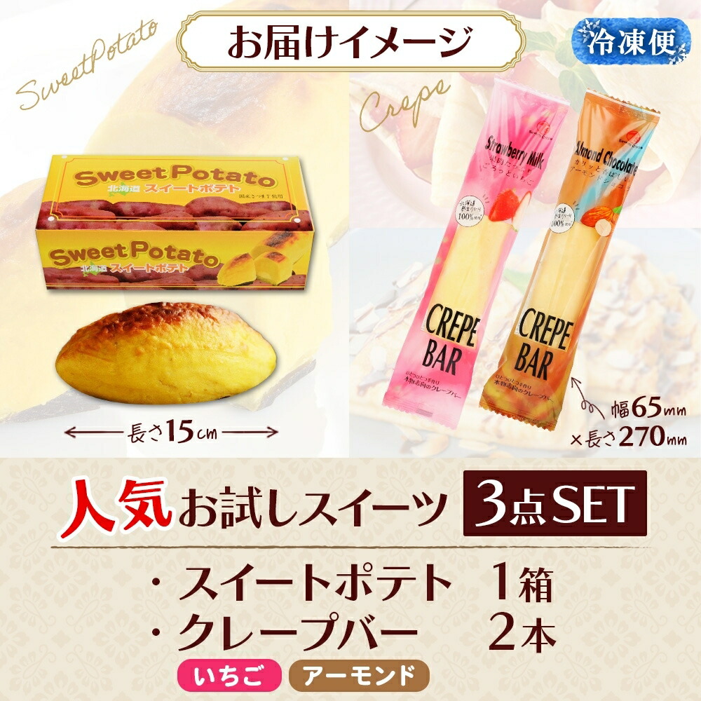 | 商品内容 | スイートポテト 250g 1個入 クレープバー(ごろっといちご) 1個入 クレープバー(アーモンドショコラ) 1個入 |