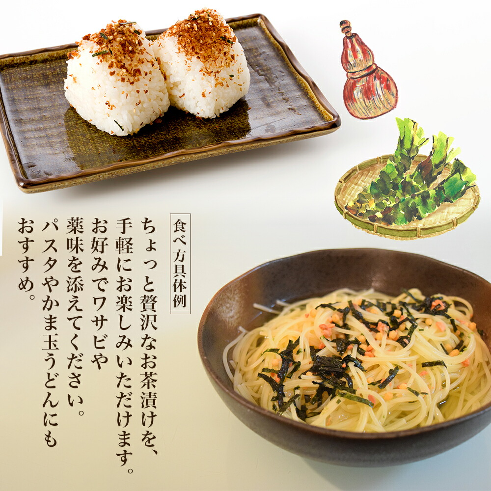 | 原材料 | 【北海道秋鮭茶漬】 食塩(国内製造)、鮭フレーク、あられ、ぶどう糖、粉あめ、澱粉、のり、かつお粉末、昆布粉末、砂糖、抹茶/調味料(アミノ酸等)、加工澱粉、着色料(パプリカ色素) 【知床鶏だし茶漬け】 知床鶏チキンパウダー(北海道製造)、食塩、ぶどう糖、粉あめ、粒状大豆たん白、にんじん、あられ、澱粉、のり、かつお粉末、ねぎ、昆布粉末、砂糖、抹茶/調味料(アミノ酸等)、加工澱粉、(一部に小麦・大豆・鶏肉を含む) 【紀州梅茶漬け】 食塩(国内製造)、粒状梅果肉、あられ、ぶどう糖、粉あめ、澱粉、のり、かつお粉末、昆布粉末、砂糖、抹茶/調味料(アミノ酸等)、加工澱粉 【北海道秋鮭・とろろ茶漬】 食塩(国内製造)、鮭フレーク、あられ、ぶどう糖、粉あめ、とろろ昆布、澱粉、のり、かつお粉末、昆布粉末、砂糖、抹茶/調味料(アミノ酸等)、加工澱粉、着色料(パプリカ色素) 【北海道秋鮭・明太子茶漬け】 食塩(国内製造)、あられ、鮭フレーク、ぶどう糖、粉あめ、粒明太子、澱粉、のり、かつお粉末、昆布粉末、砂糖、抹茶、唐辛子/調味料(アミノ酸等)、加工澱粉、着色料(パプリカ色素)、(一部に大豆・さけを含む) |