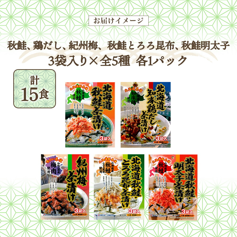 | 商品内容 | 北海道お茶漬け5種食べ比べ 計15個セット ・北海道秋鮭茶漬け 22.5g(7.5g×3袋)×1パック ・知床鶏だし茶漬け 27g(9g×3袋)×1パック ・紀州梅茶漬け 22.5g(7.5g×3袋)×1パック ・北海道秋鮭とろろ昆布茶漬け 24g(8g×3袋)×1パック ・北海道秋鮭明太子茶漬け 22.5g(7.5g×3袋)×1パック |