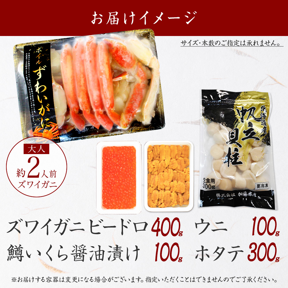 かに 海鮮 北の四宝海鮮セット(ズワイガニビードロ400g 鱒いくら100g うにチリ産100g ホタテ300g)カニ むき身 数量限定