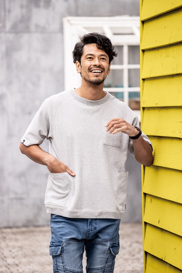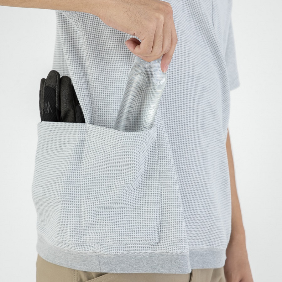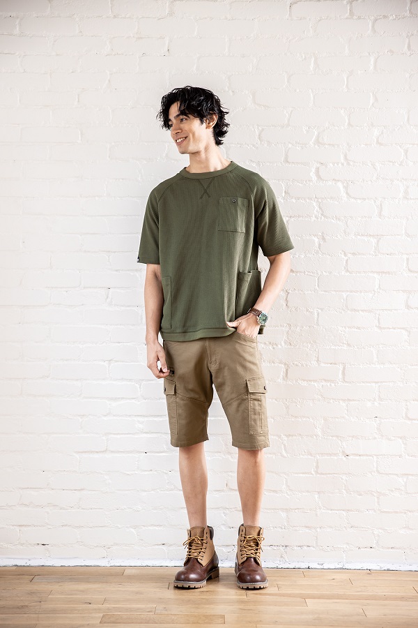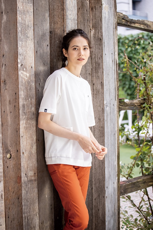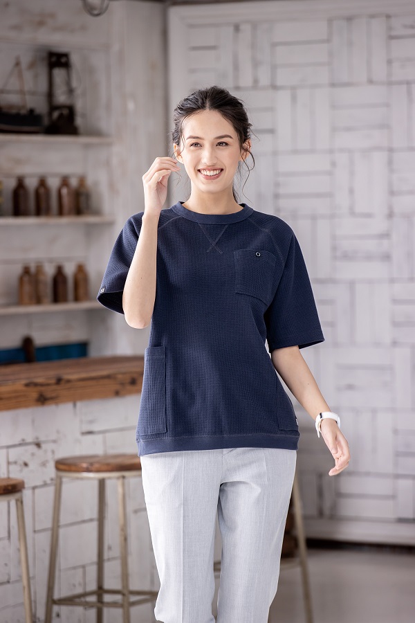 ワッフル生地の点接触でサラサラ触感の5ポケットTシャツ。