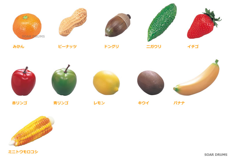 鮮やかな色彩で見るからに美味しそうな“フルーツ”。実はシェーカーという楽器です!振るとシャカシャカ音がします。ユーモアいっぱいのシェーカーシリーズです。リズム楽器、幼児知育楽器として手軽に楽しく扱え、もちろんカラオケにも最適です。