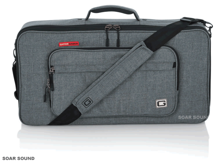 GT-2412-GRY はエフェクトボード、エフェクター収納用バッグです。内寸610×305×114mm までのエフェクトボード、エフェクターを収納可能ケーブル等の小物の収納に最適なポケットを表と裏側に装備地面に接地する底面部をブラックのラバーで保護握りやすさを考えたパッド入りのハンドル取り外し可能なショルダーストラップ