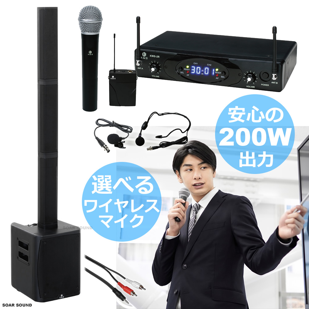 KWS 200W出力 ワイヤレスマイク 2本セット Bluetooth ミキサー内蔵 ポータブル コラムスピーカー PAシステム ハンドマイク ヘッドセット ピンマイク 200BT-W2