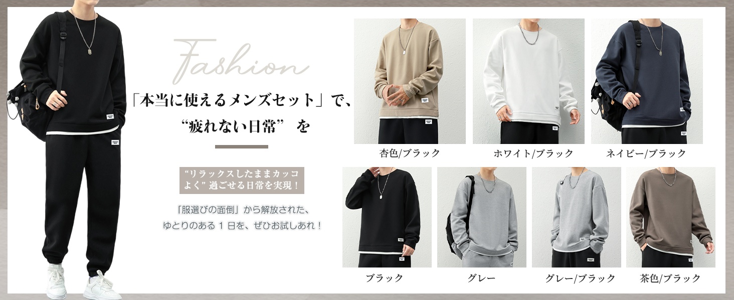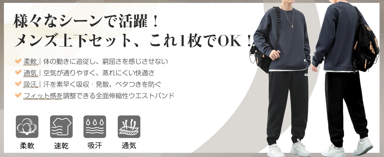 【ノーフードプルオーバー+パンツで洗練されたルックス】 上着はシンプルなノーフードプルオーバー仕様で、すっきりとした印象に。ボトムスは長ズボンで、動きやすくスタイリッシュなデザインが魅力です。ジャージ メンズ 上下セットとしての統一感があり、セットアップならではの洗練されたルックスが実現できます。