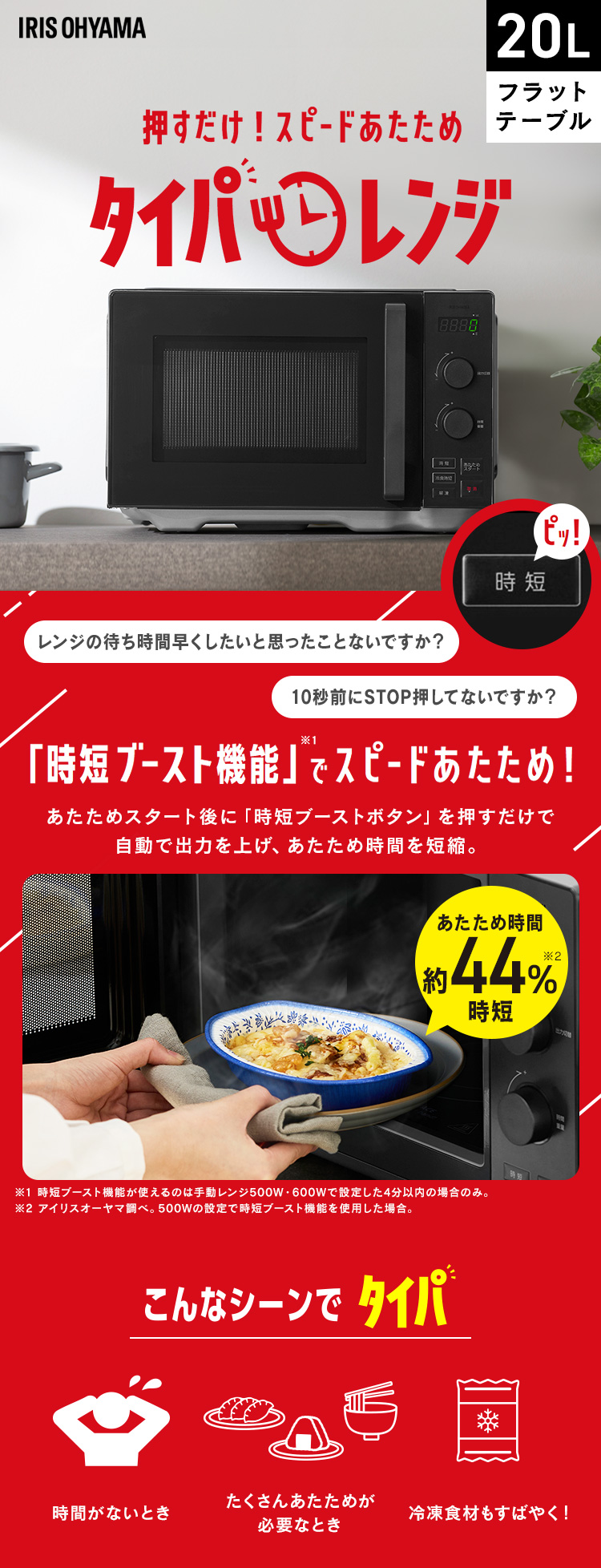 (検索用:電子レンジ 単機能 フラット レンジ 20L 温めのみ 時短ブースト 冷食ブースト スピードあたため 時短 冷凍食品 簡単お手入れ ダイヤル式 簡単操作 新生活 一人暮らし ブラック タイパレンジ 4967576817202)
