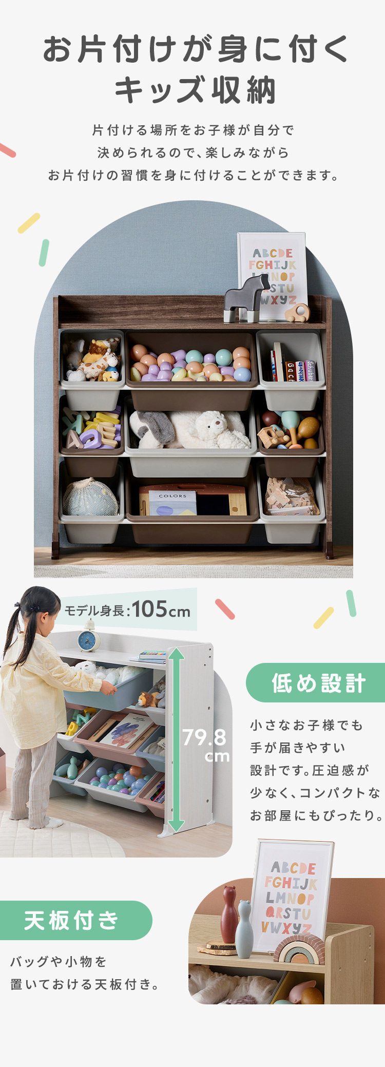 色分けされていることで「どこに何を片付ける」のルールが決めやすく、お子様の自立心をサポートし楽しくお片付けができる収納用品です。
