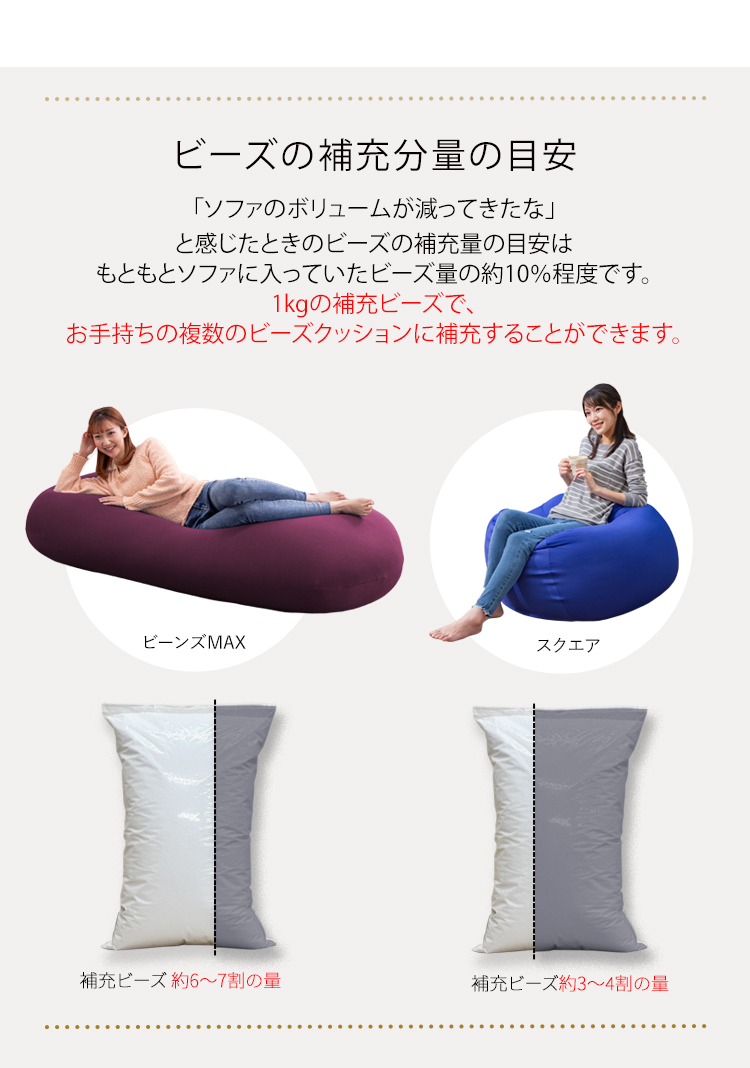 (検索用:ビーンズMAX 補充ビーズ ビーズクッション用 ボリューム追加 1kg 詰め替え 日本製 ポリスチレンビーズ 調整用 中材 )
