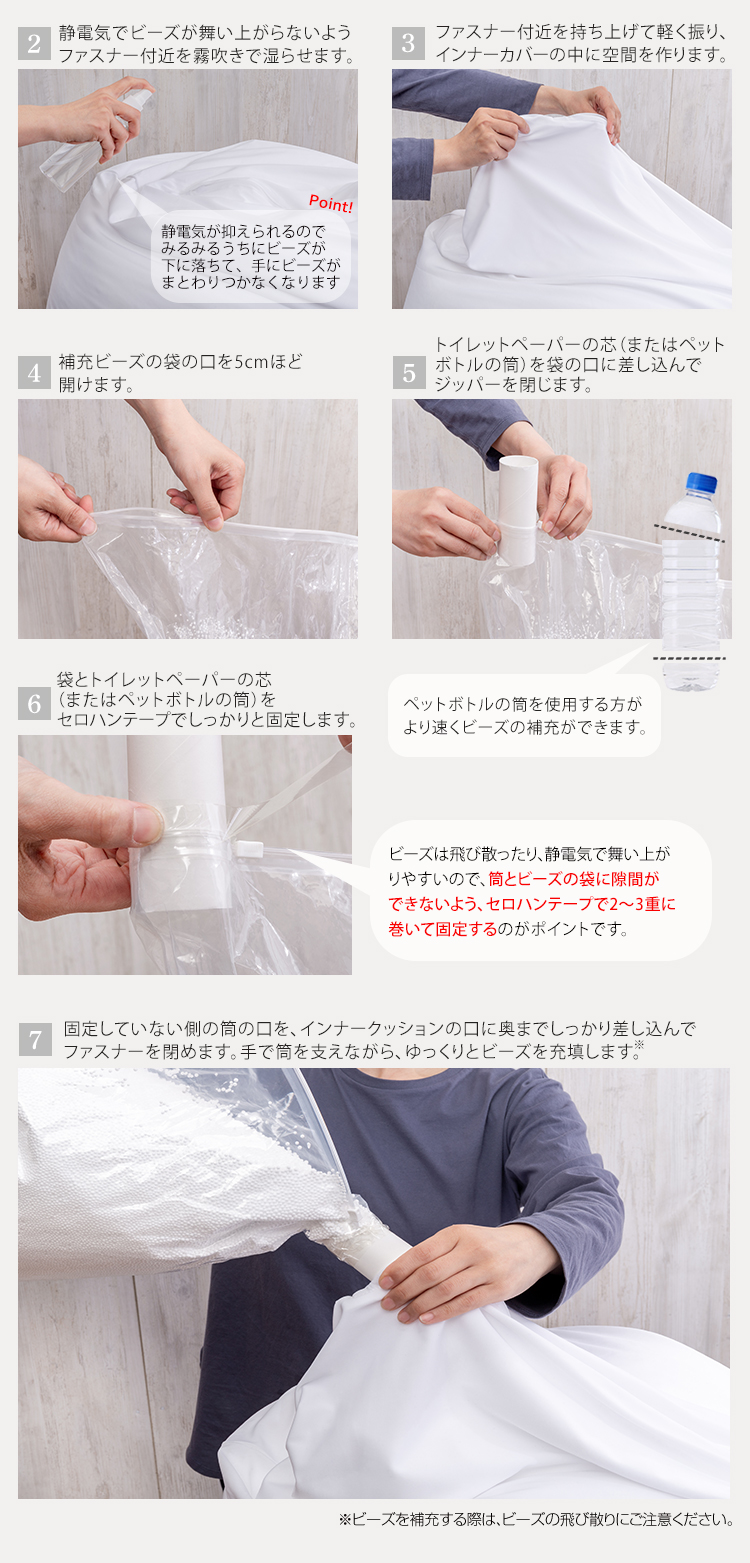 お好みの分量でビーズを補充!届いた時の座り心地が蘇ります。